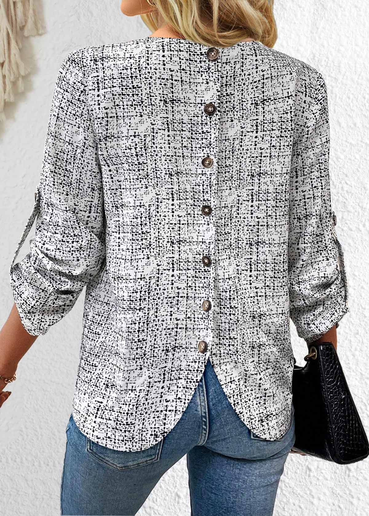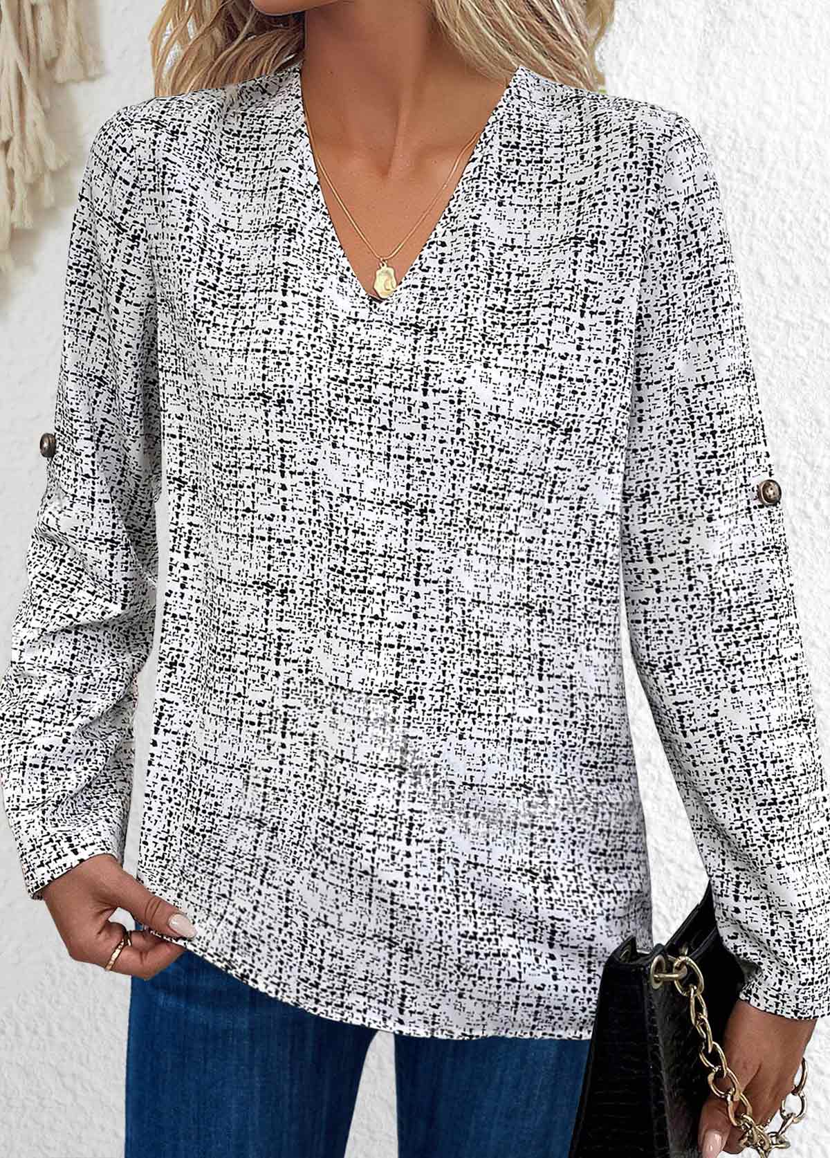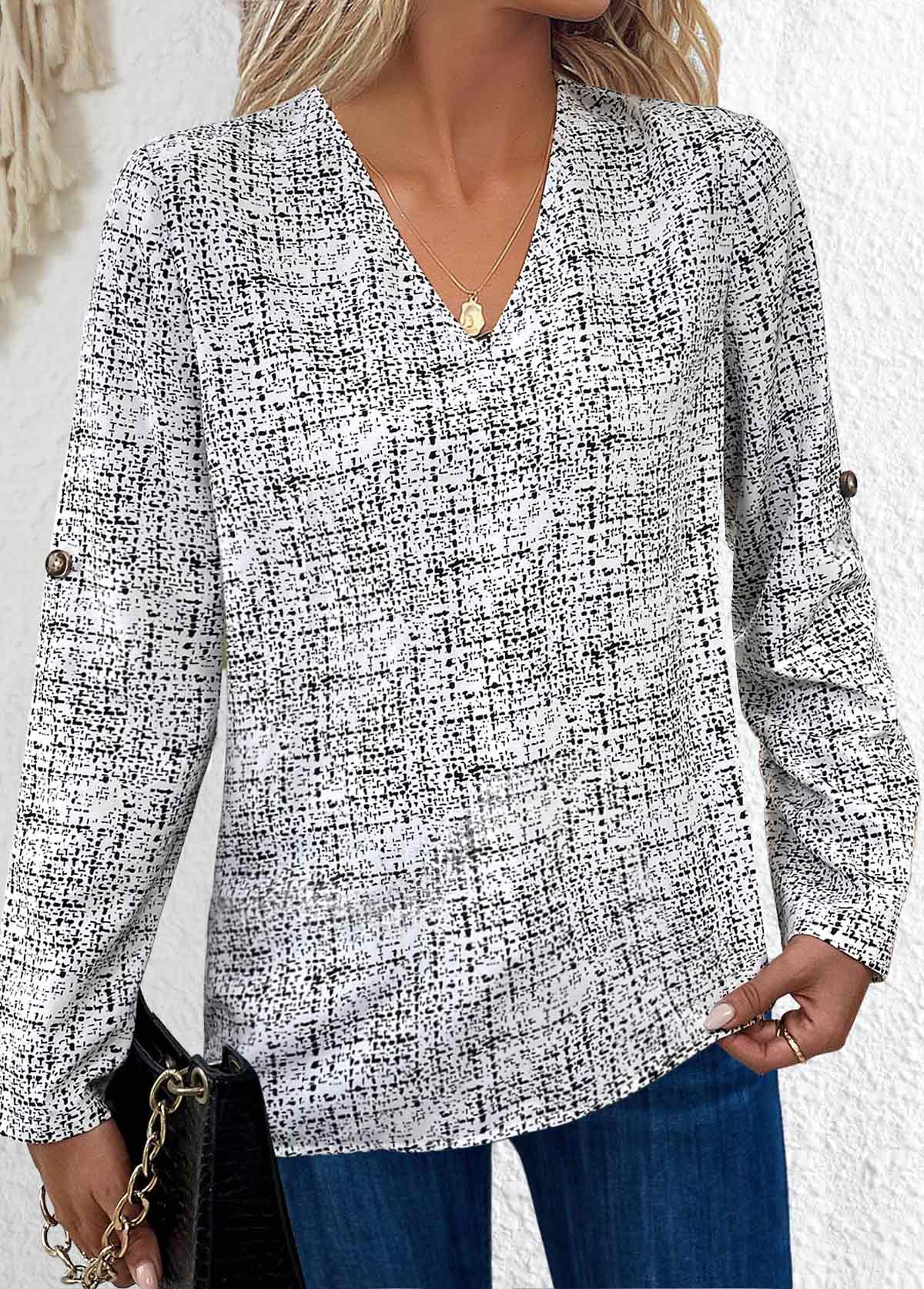 SALE Graffiti Print Button Black Long Sleeve V Neck Blouse Rosewe®