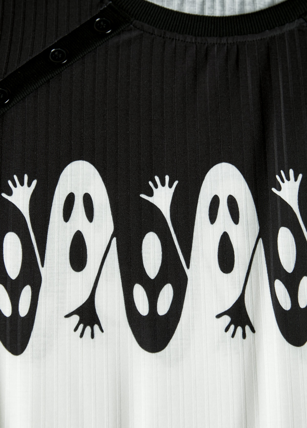 • Embrace the spooky season with this black and white raglan tee. Featuring a playful Halloween design on the chest, its tunic length offers perfect tummy coverage. Crafted from soft, stretchy knit fabric, it’s ideal for festive fun or casual wear.