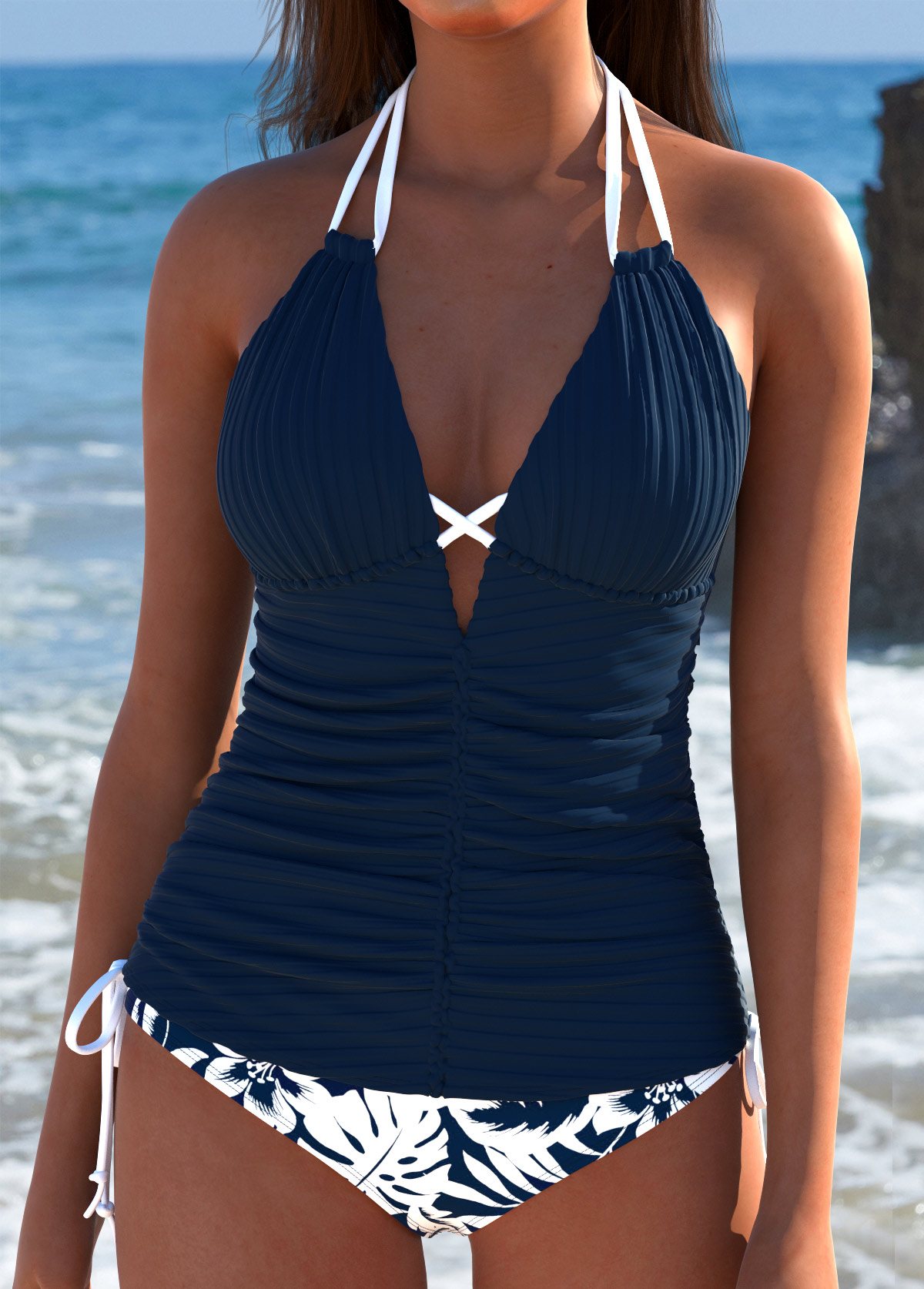 High Waisted Tropical Plants Print Navy Tankini Set Rosewe®