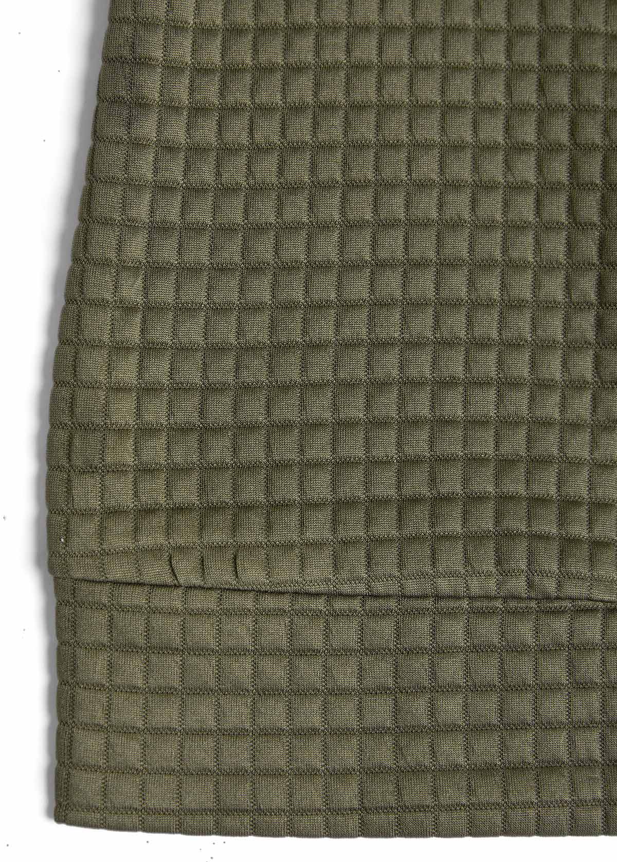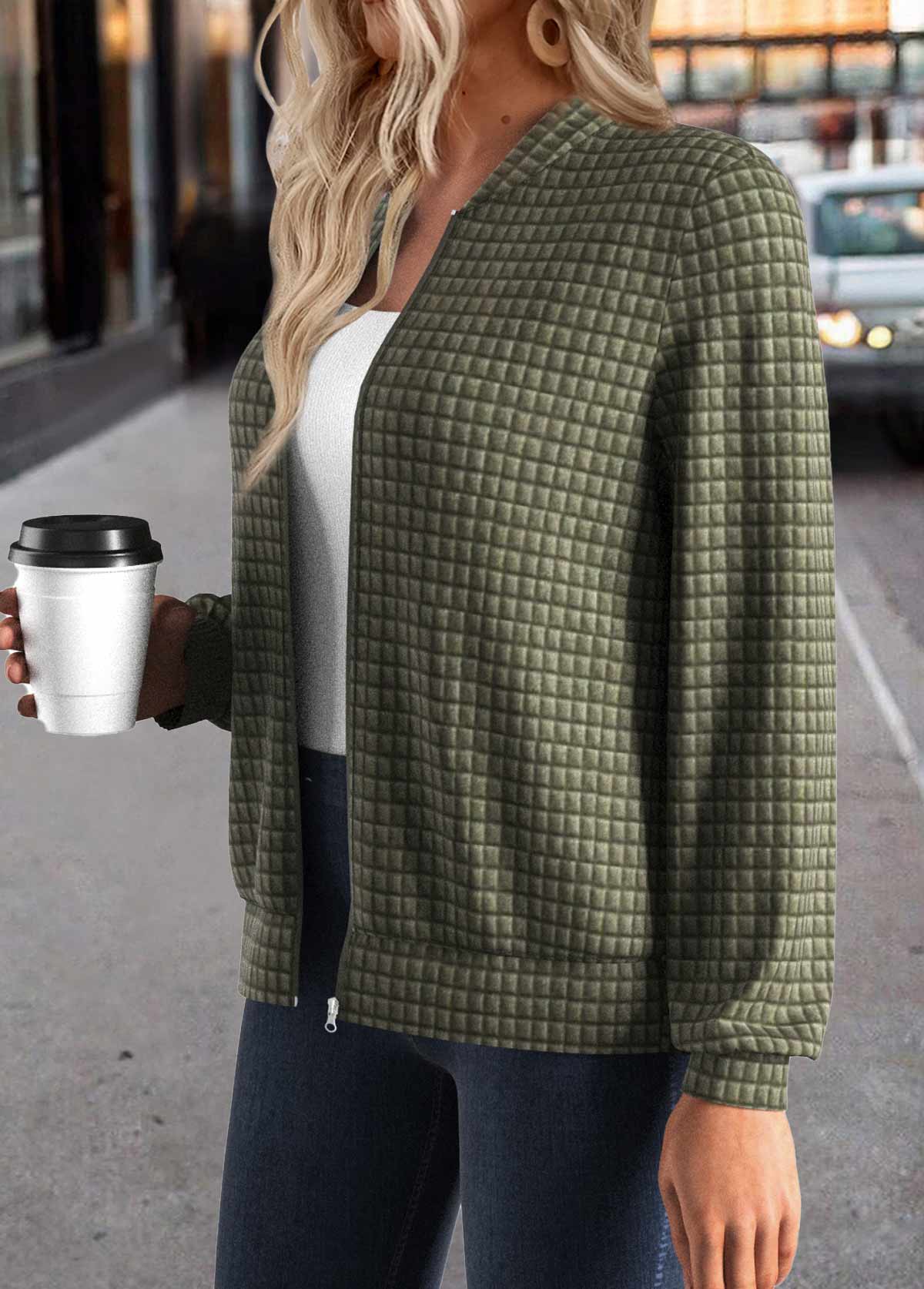 • Elevate your casual look with this Olive Green jacket, featuring a sleek stand collar that adds a touch of sophistication. The zippered front and textured jacquard design offer both style and comfort, while the soft knit fabric ensures a cozy feel. With its tunic length, it's the perfect layering piece for everyday adventures.