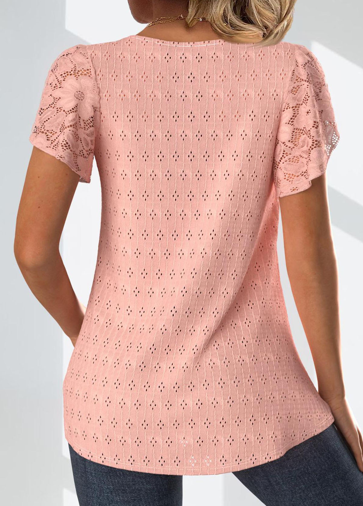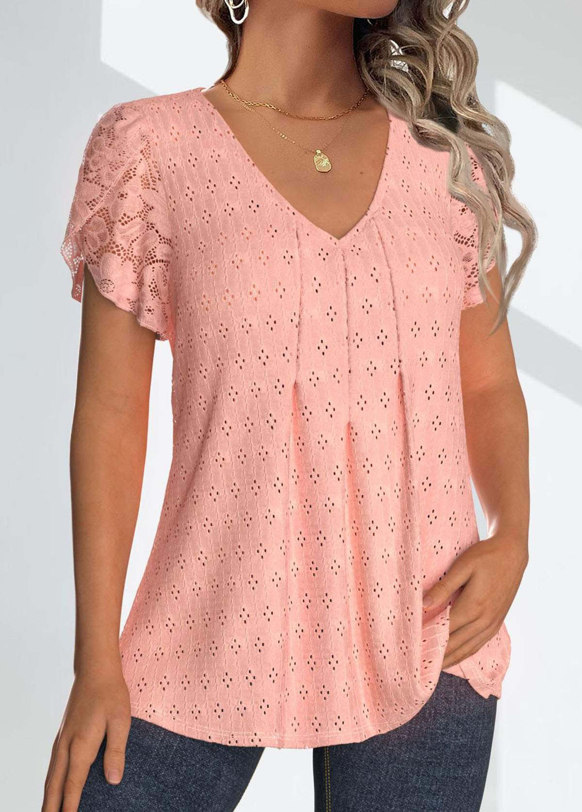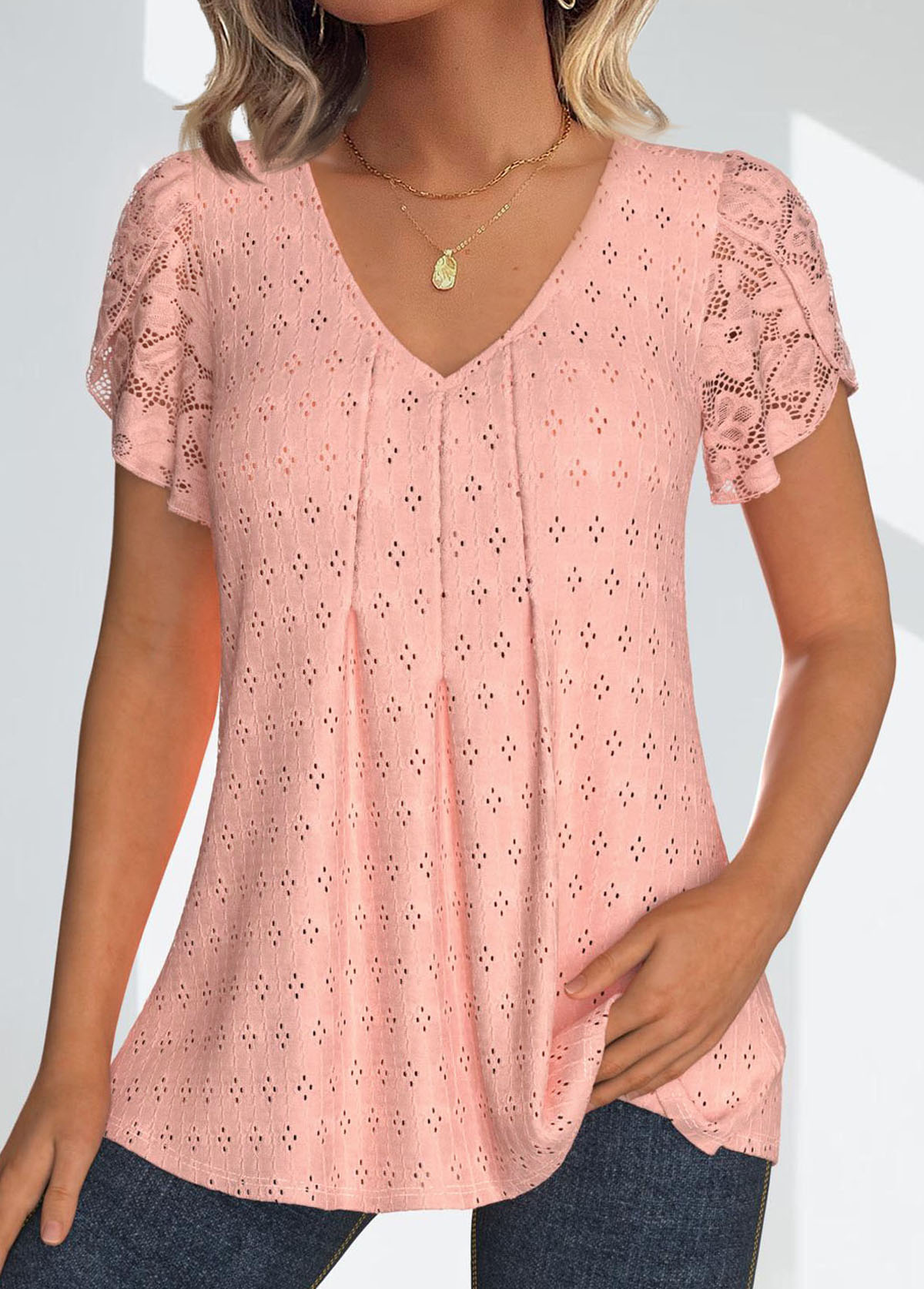 SALE Lace Dusty Pink Short Sleeve V Neck Blouse Rosewe®