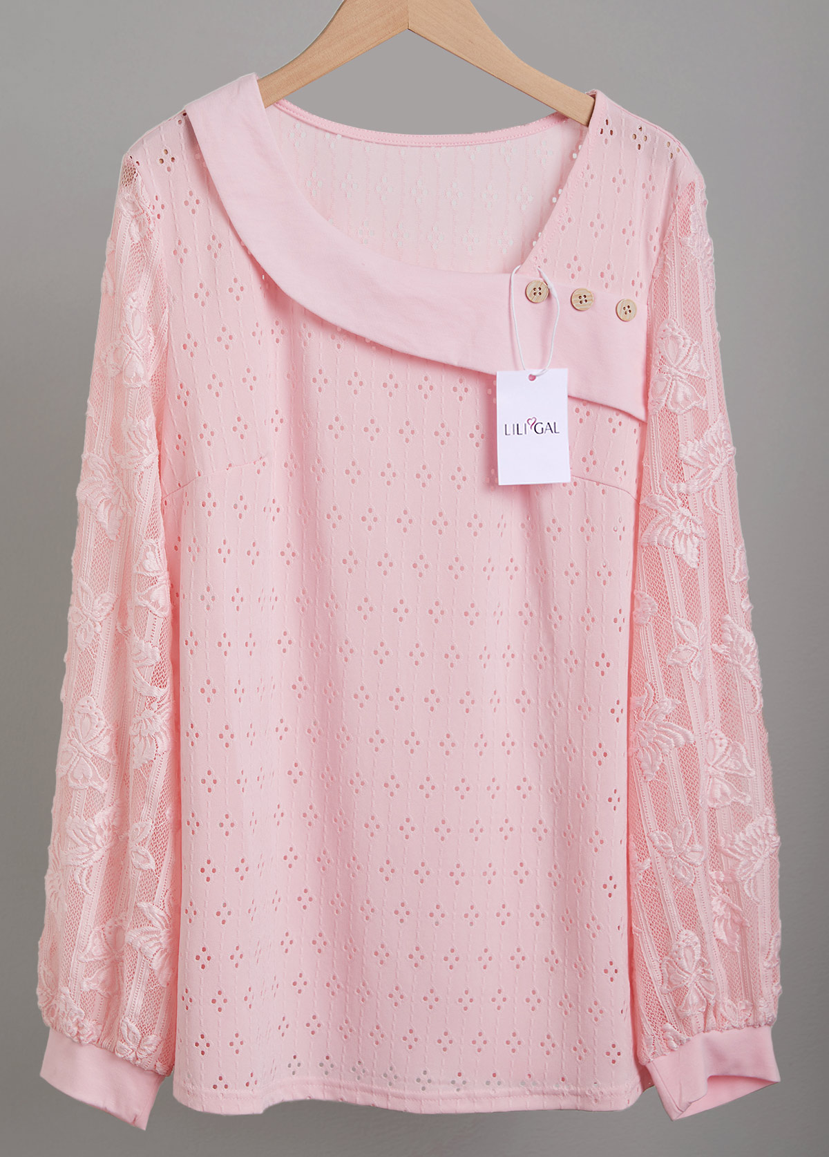 • Lace Light Pink Long Sleeve Asymmetrical Neck T Shirt