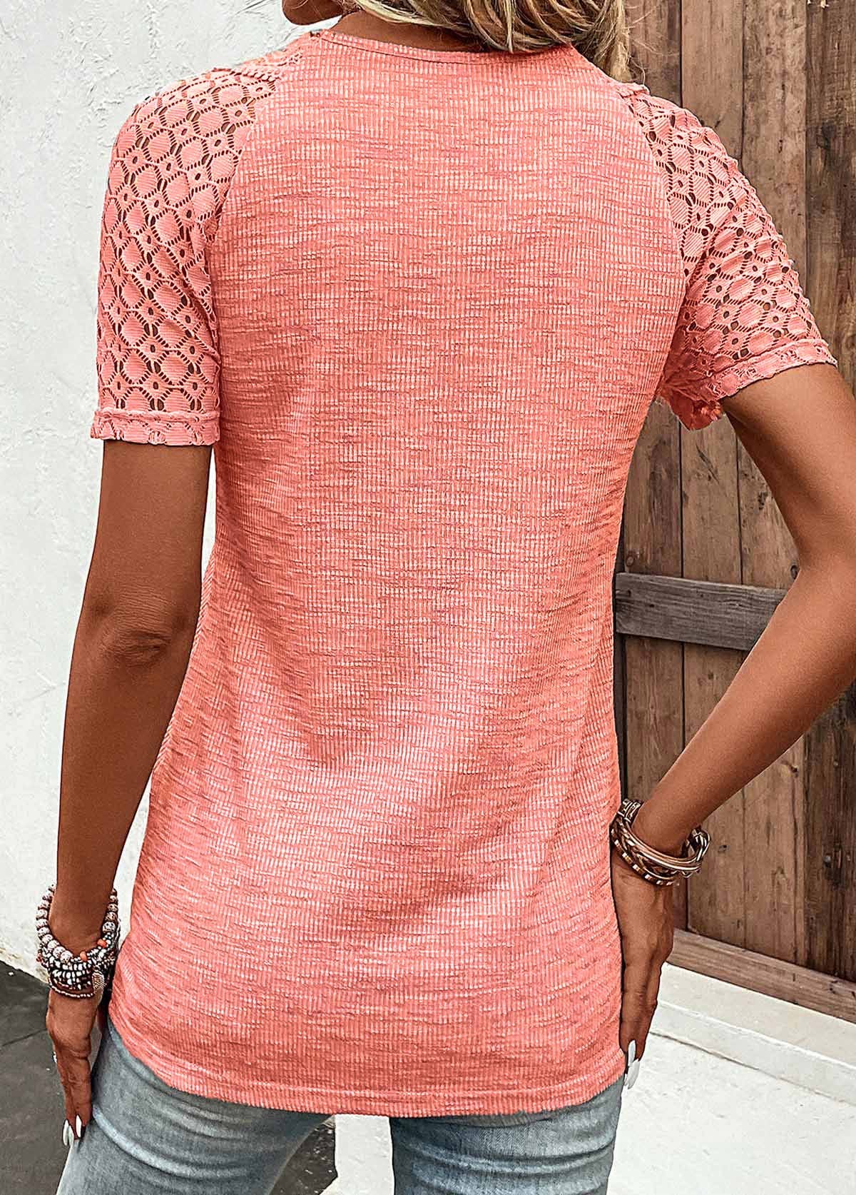 Lace Orange Short Sleeve V Neck T Shirt Rosewe®