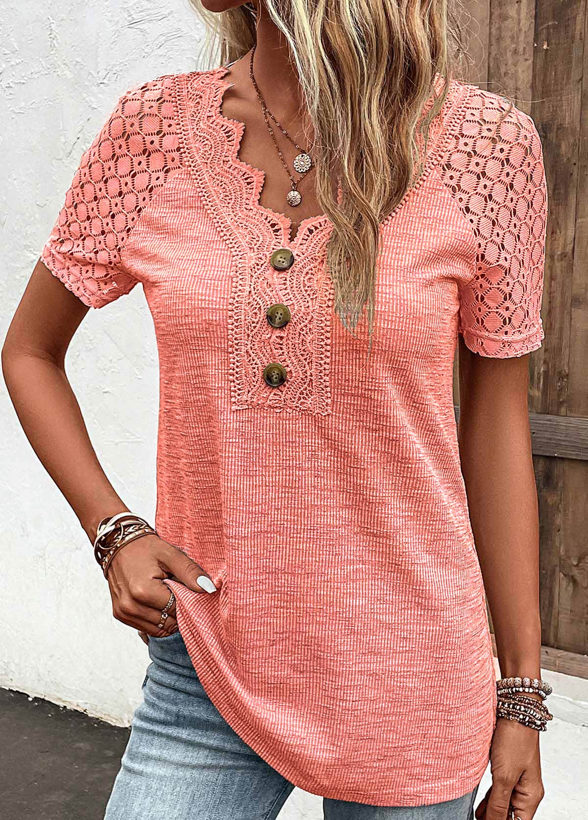 • Lace Orange Short Sleeve V Neck T Shirt