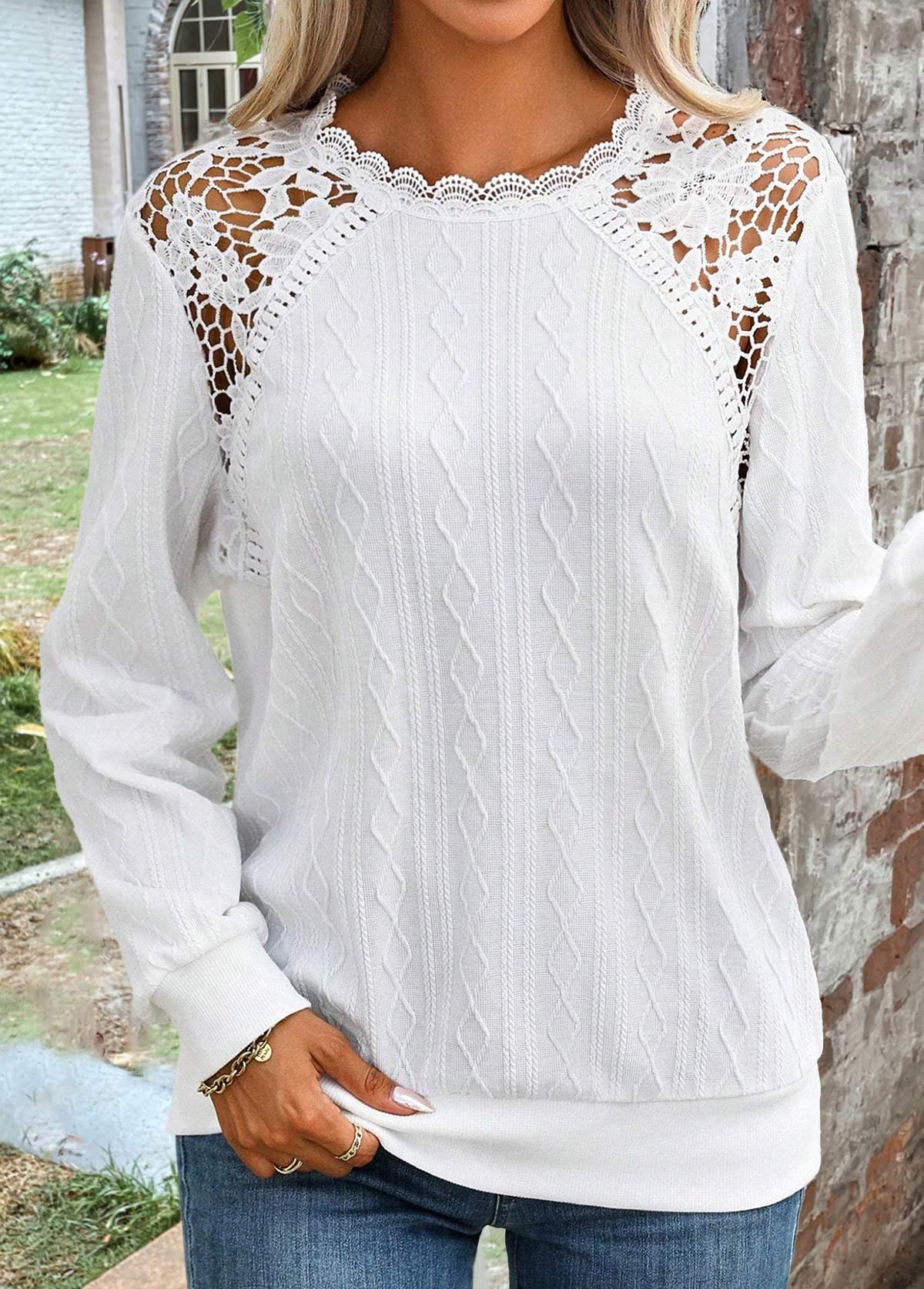 SALE Lace Round Neck Long Sleeve White Sweatshirt Rosewe®