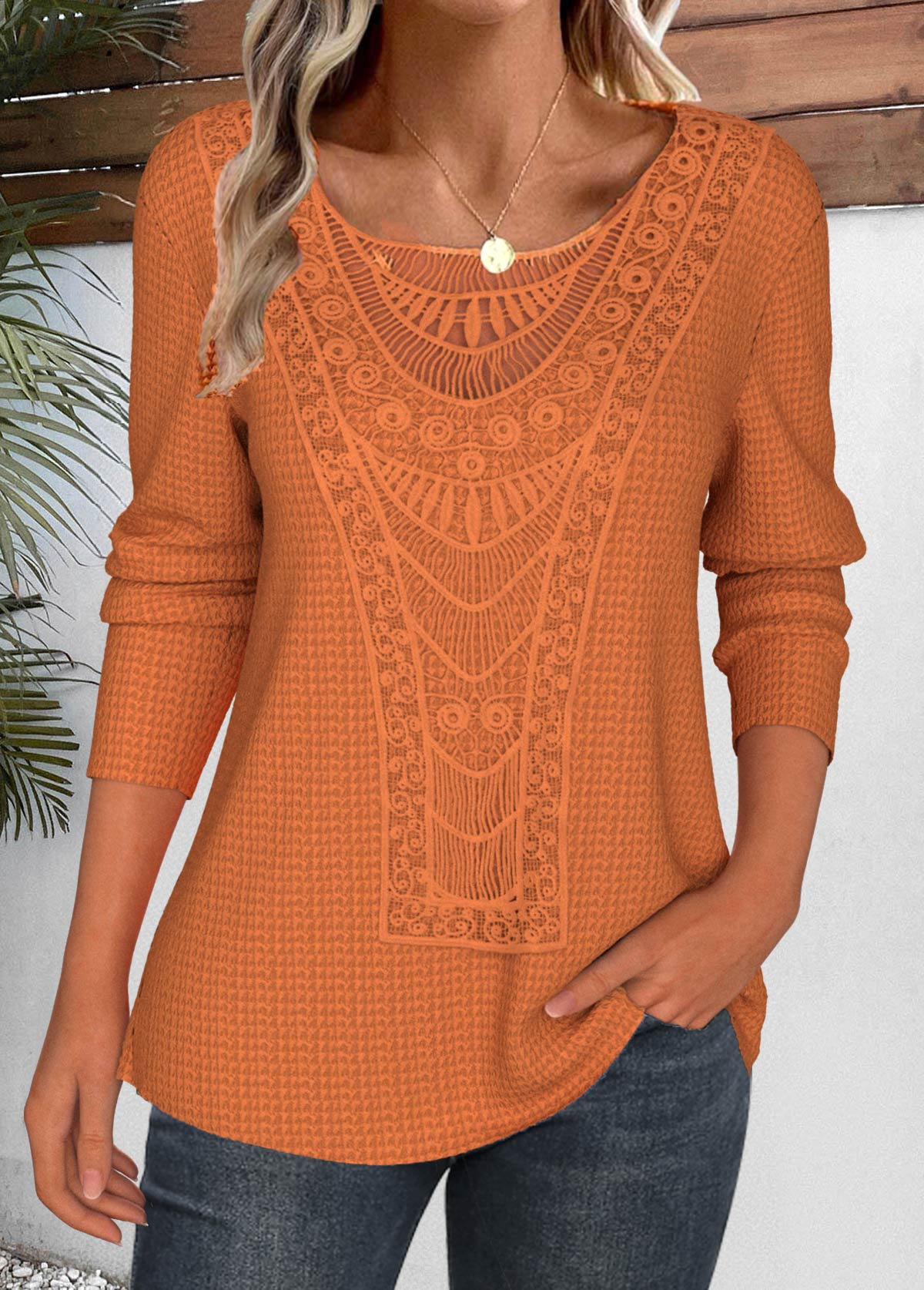 SALE Lace Terracotta Long Sleeve Round Neck T Shirt Rosewe®