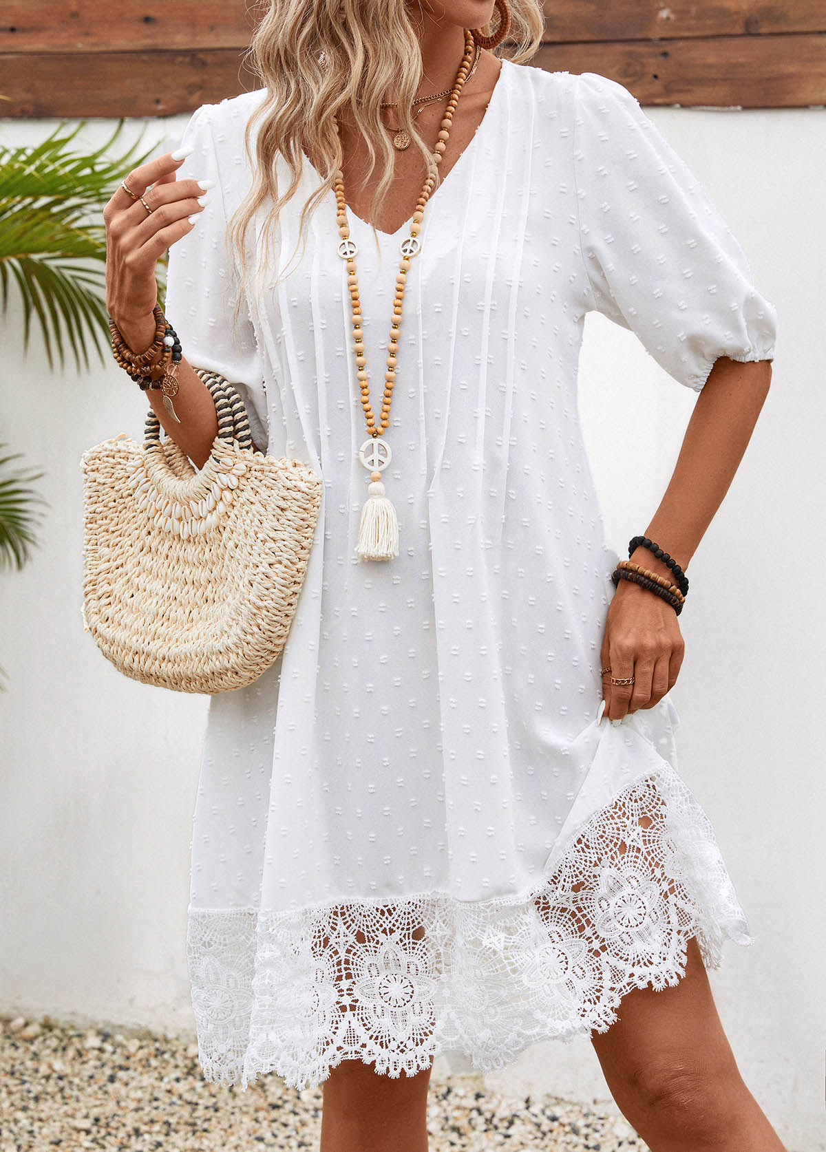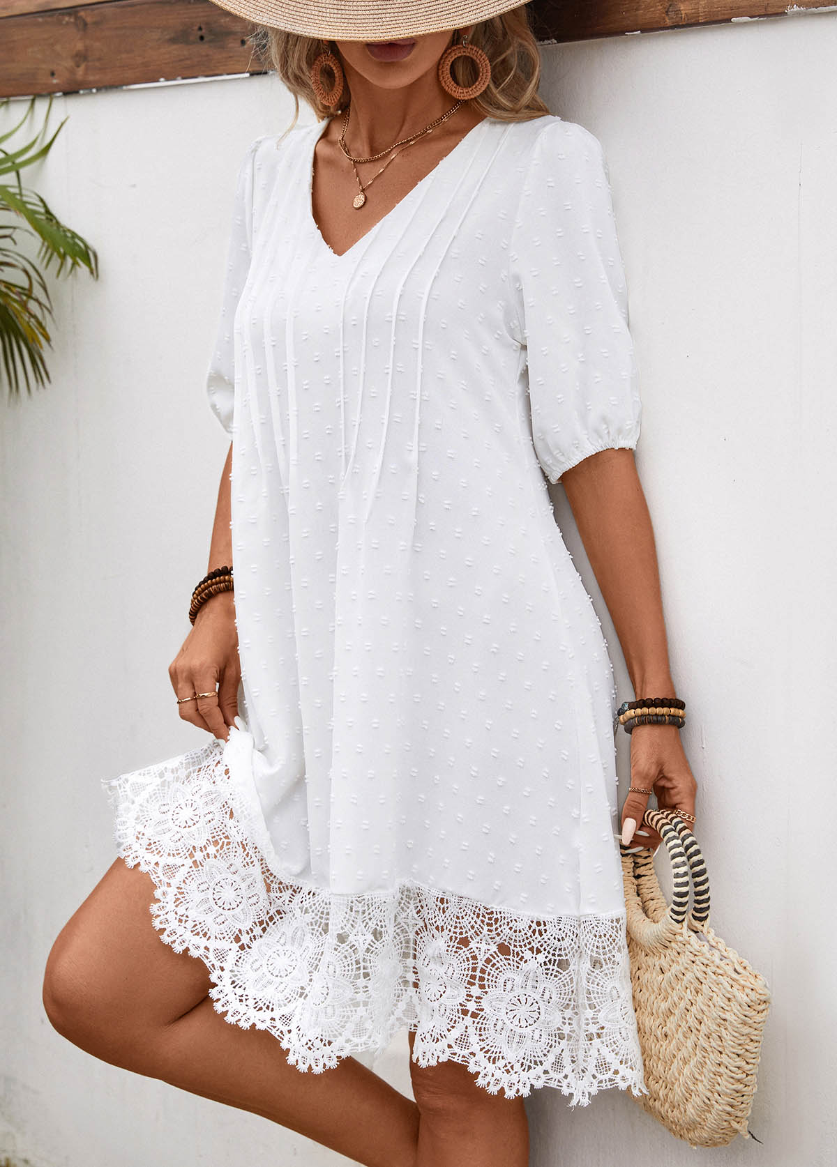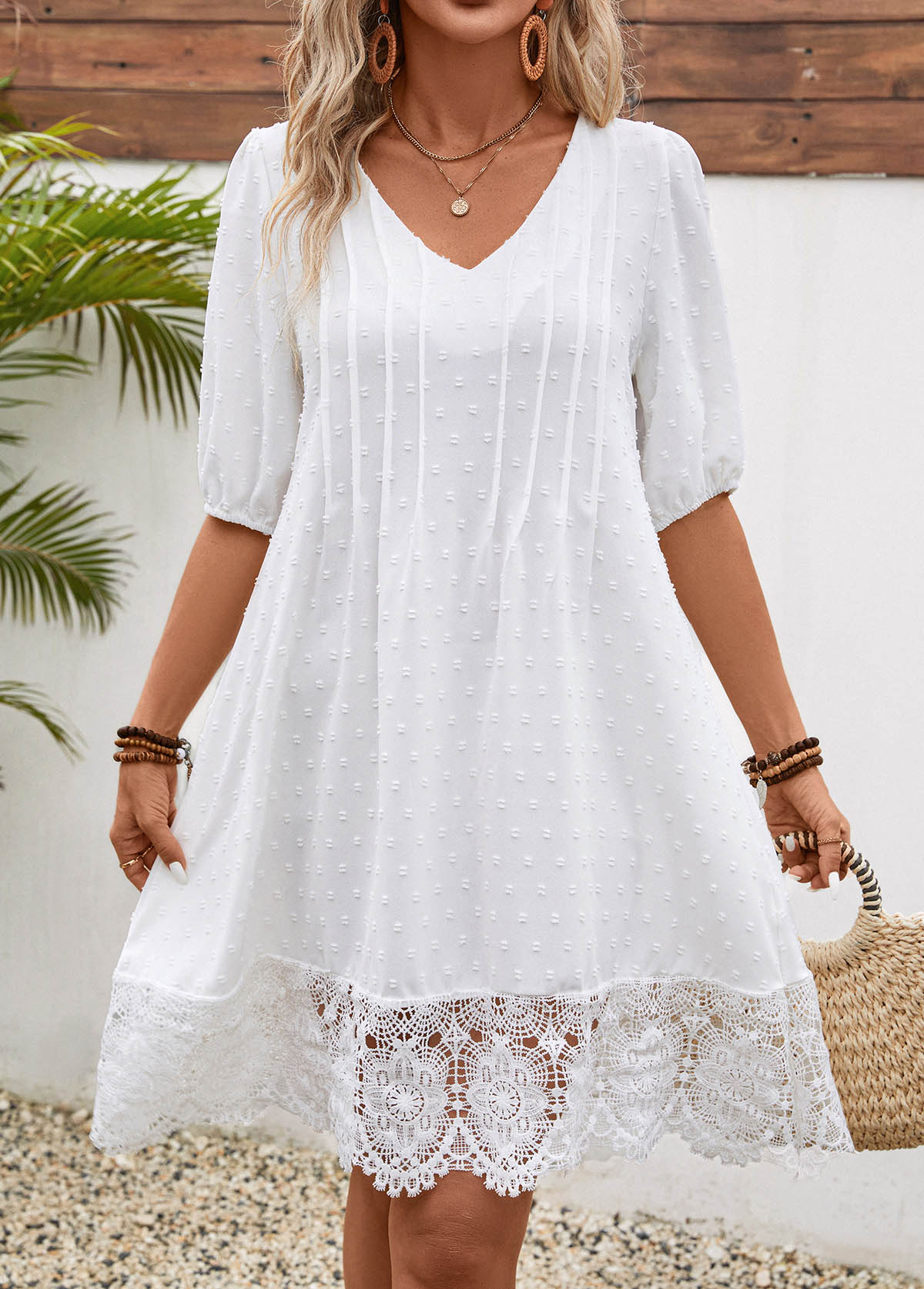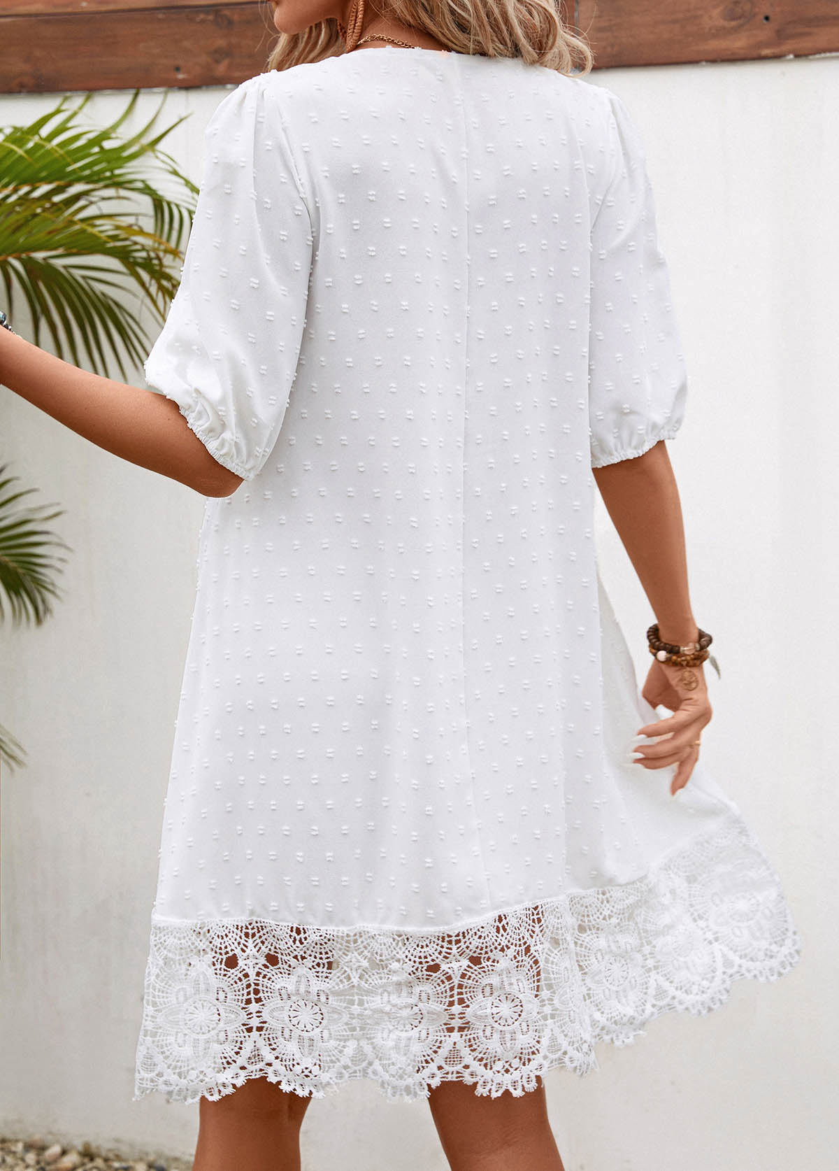• Lace White Half Sleeve V Neck Shift Dress