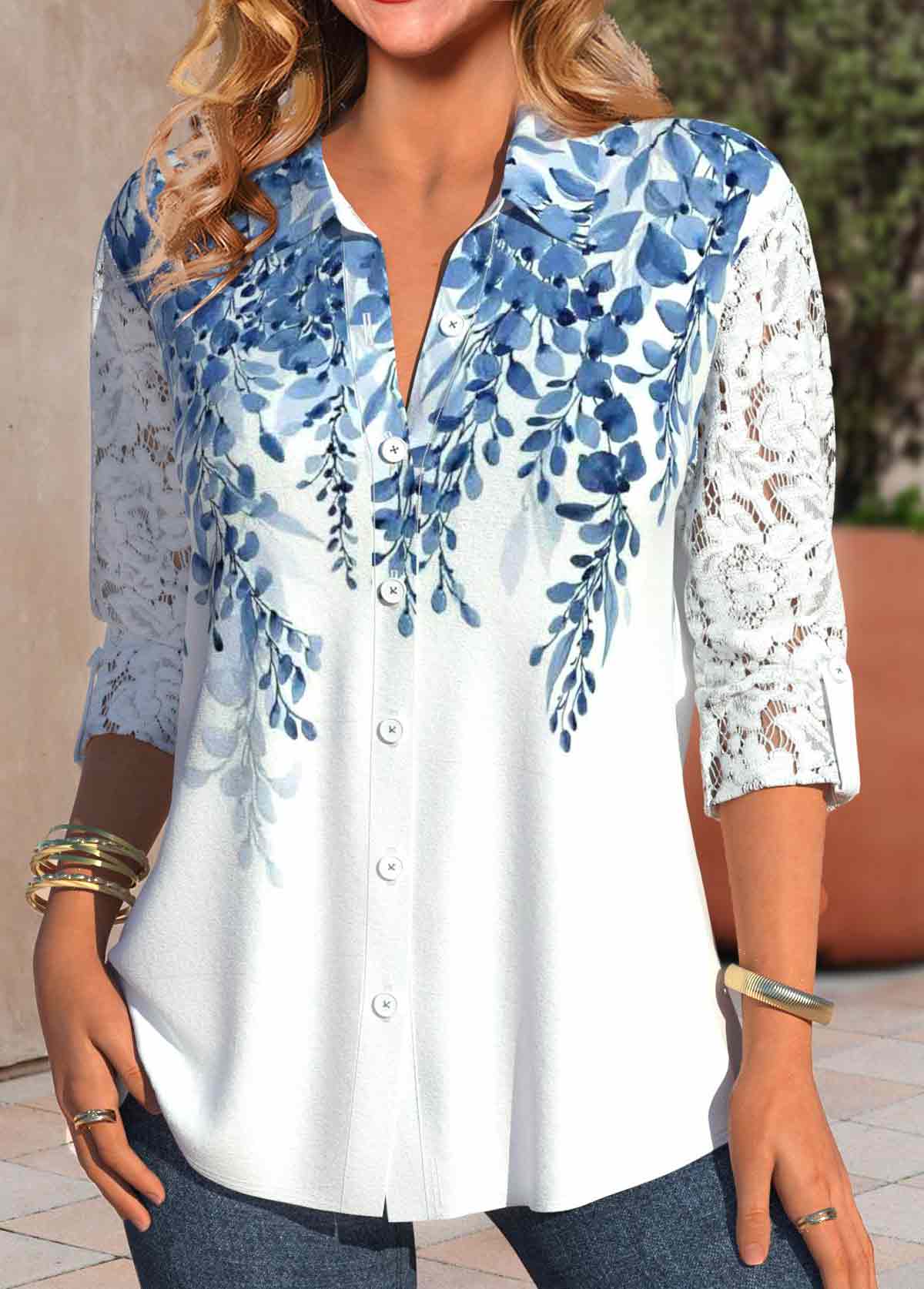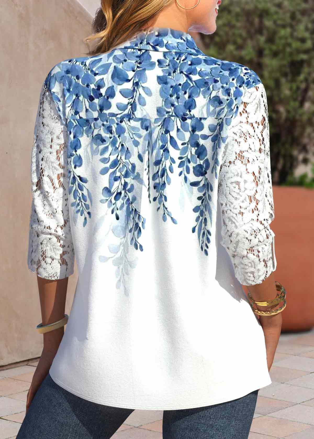 SALE Leaf Print Lace White Long Sleeve Shirt Collar Blouse Rosewe®