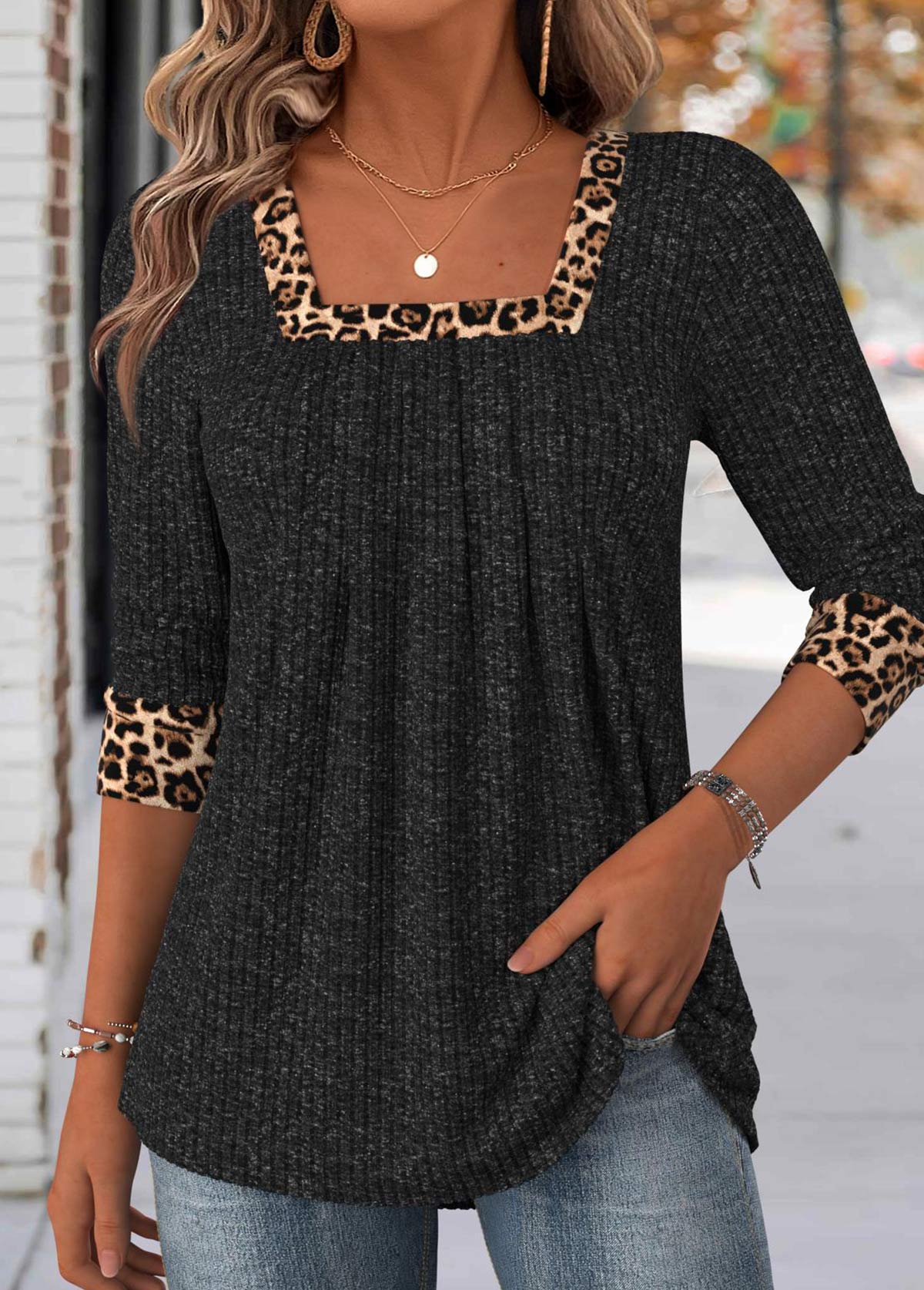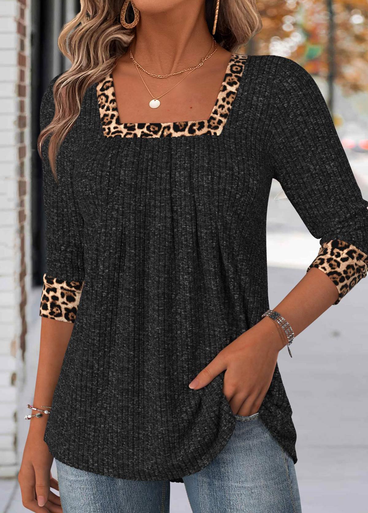 • Leopard Black Long Sleeve Square Neck T Shirt