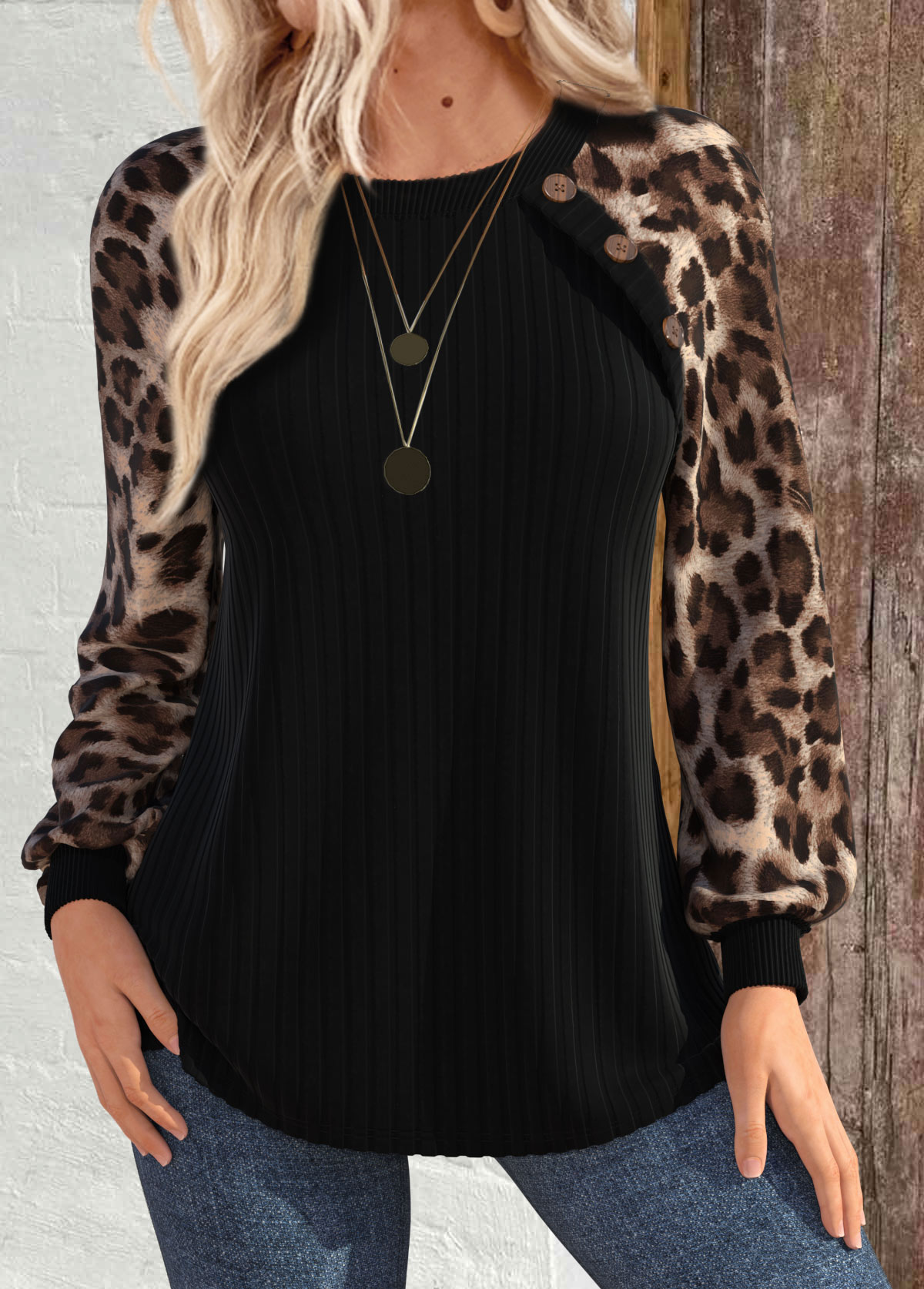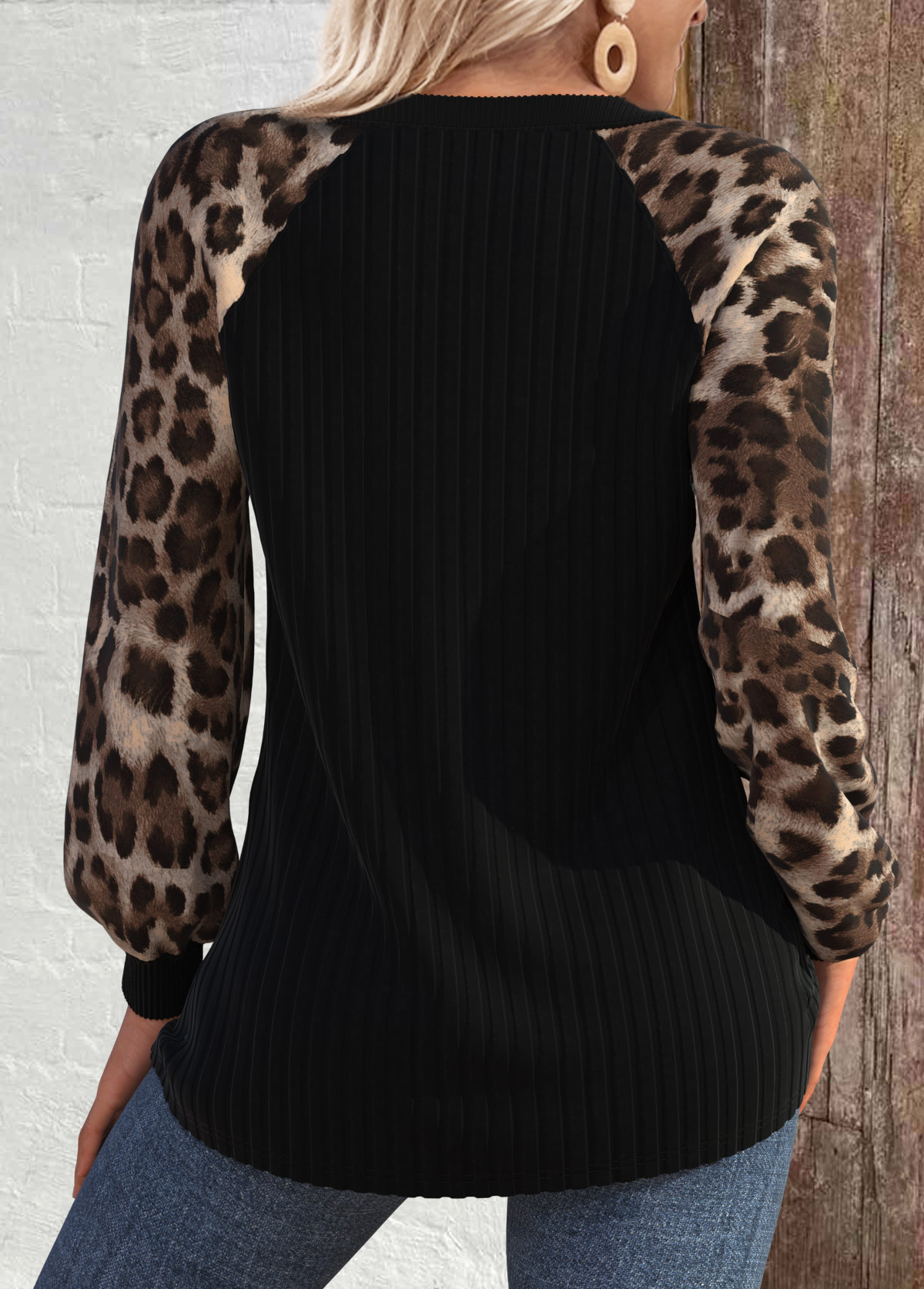 SALE Leopard Patchwork Black Long Sleeve Round Neck Sweatshirt Rosewe®