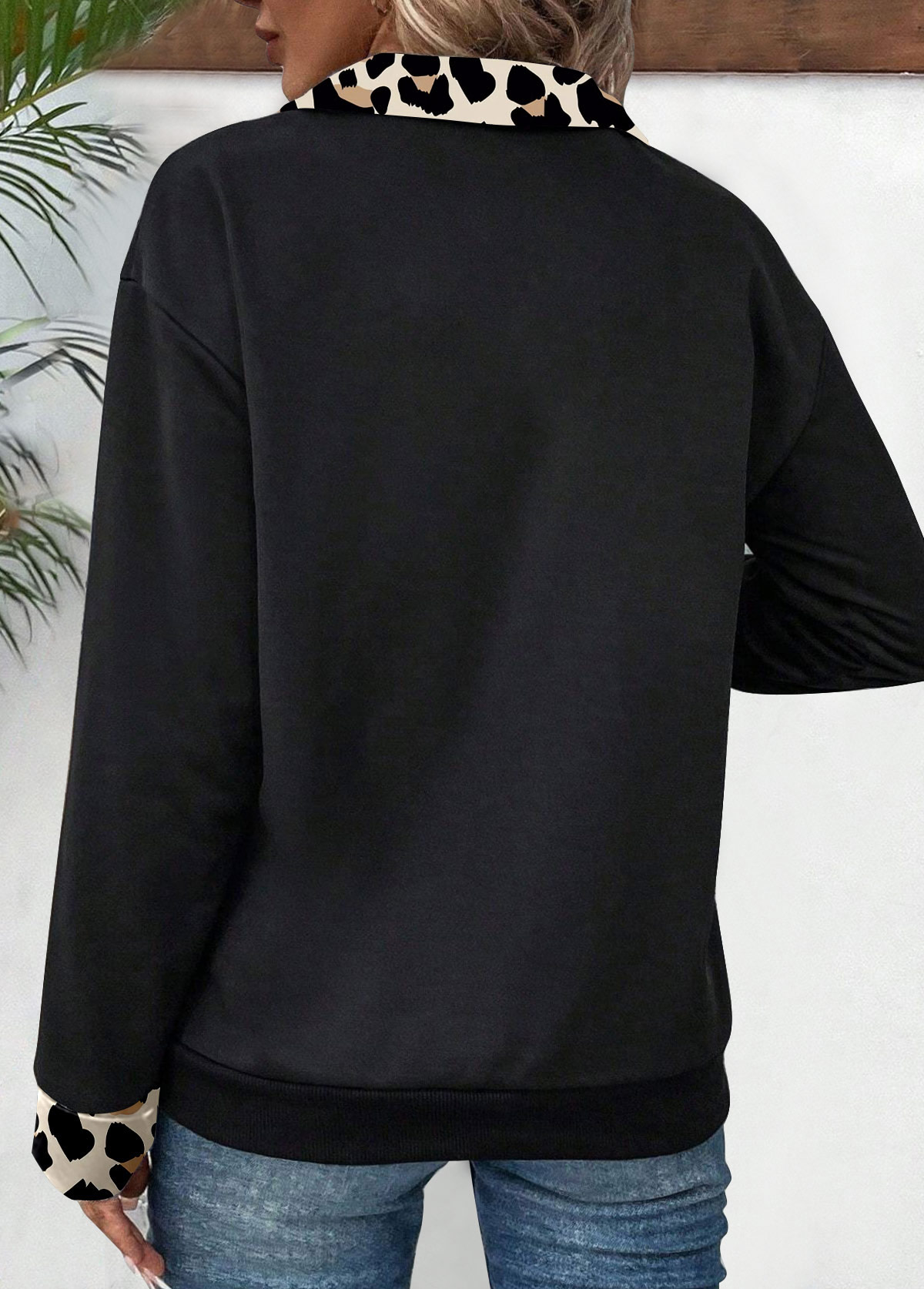 • Leopard Patchwork Black Long Sleeve Turn Down Collar Sweatshirt