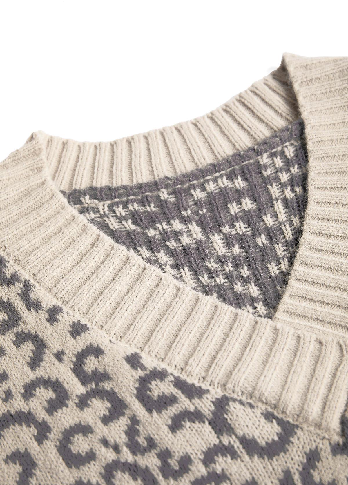 Leopard Patchwork Light Camel Long Sleeve V Neck Sweater Rosewe®