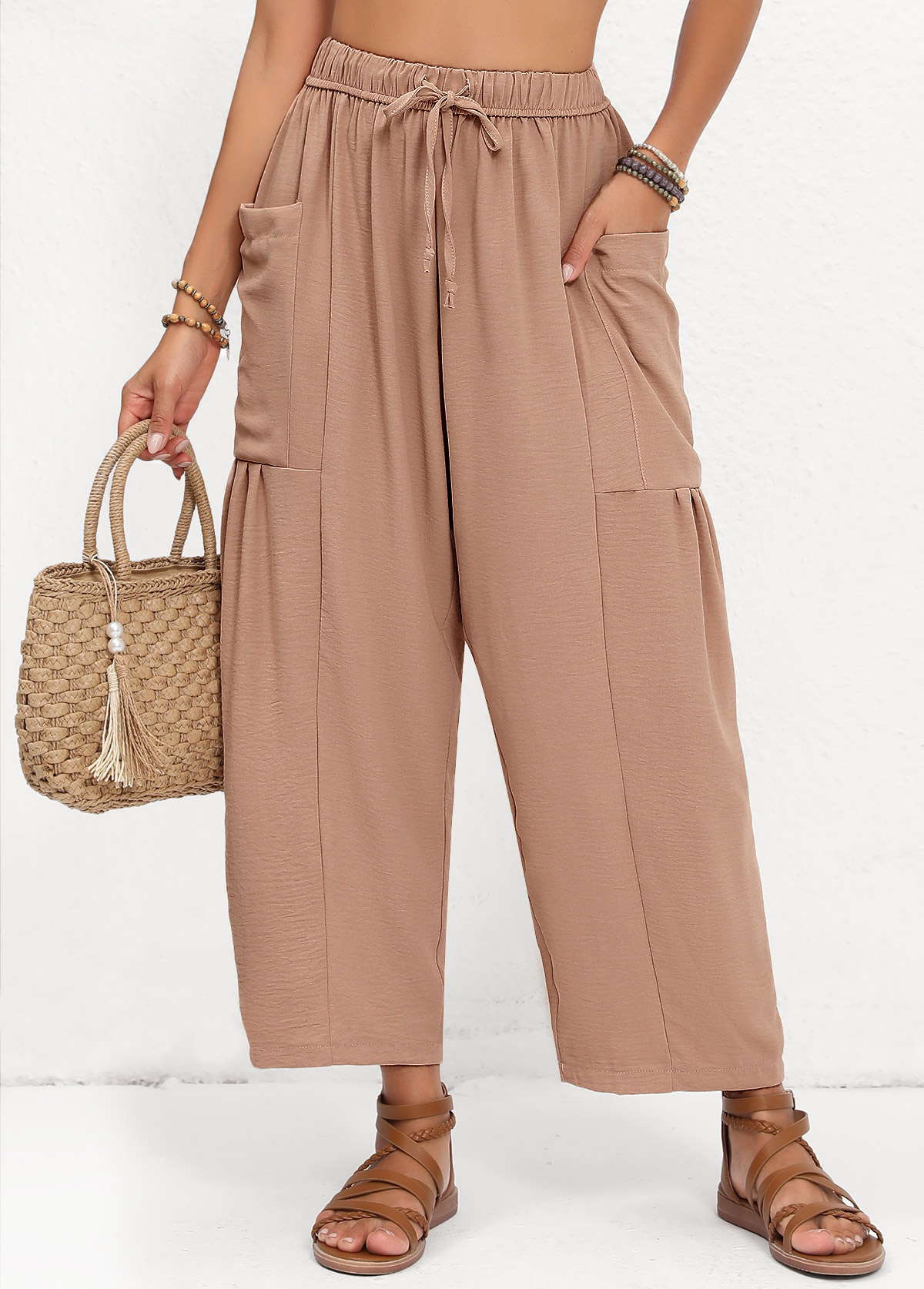 SALE Light Coffee Elastic Waist Pocket High Waisted Pants Rosewe®