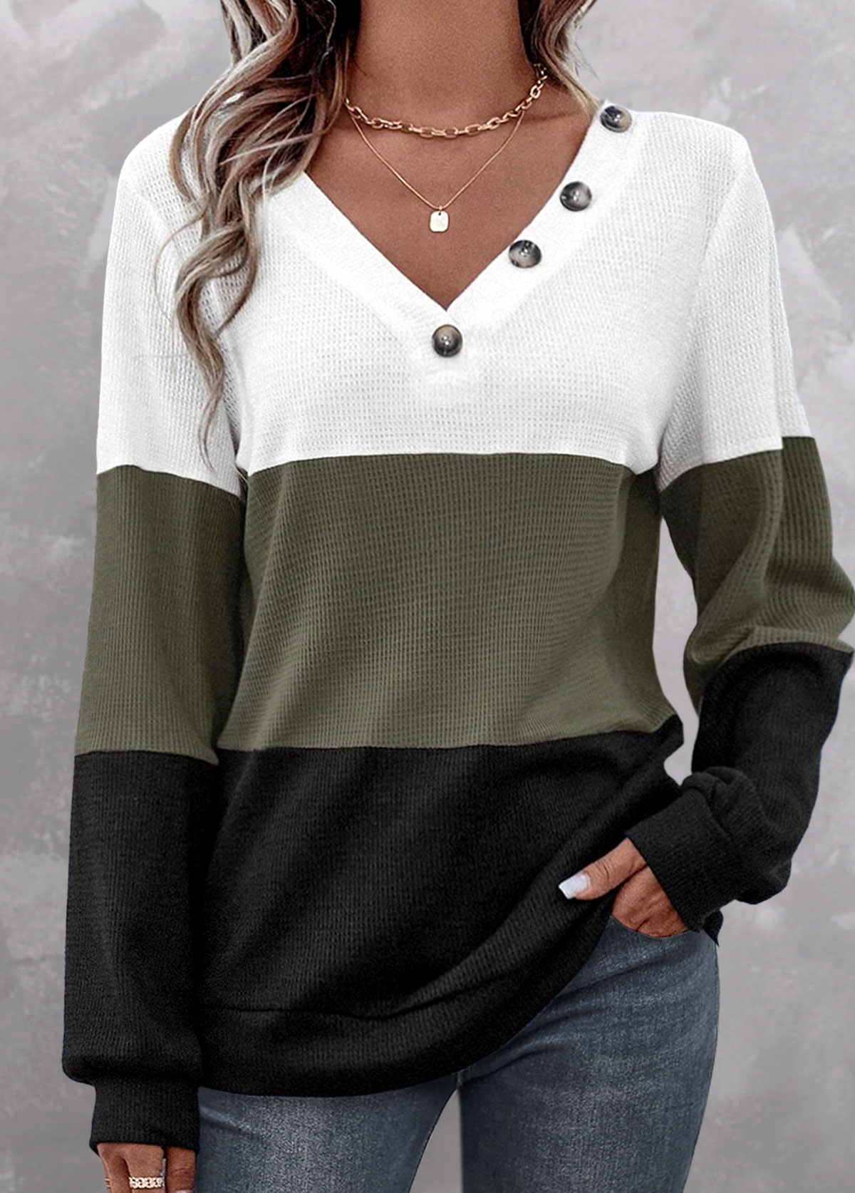 SALE Long Sleeve Patchwork Olive Green V Neck Sweatshirt Rosewe®