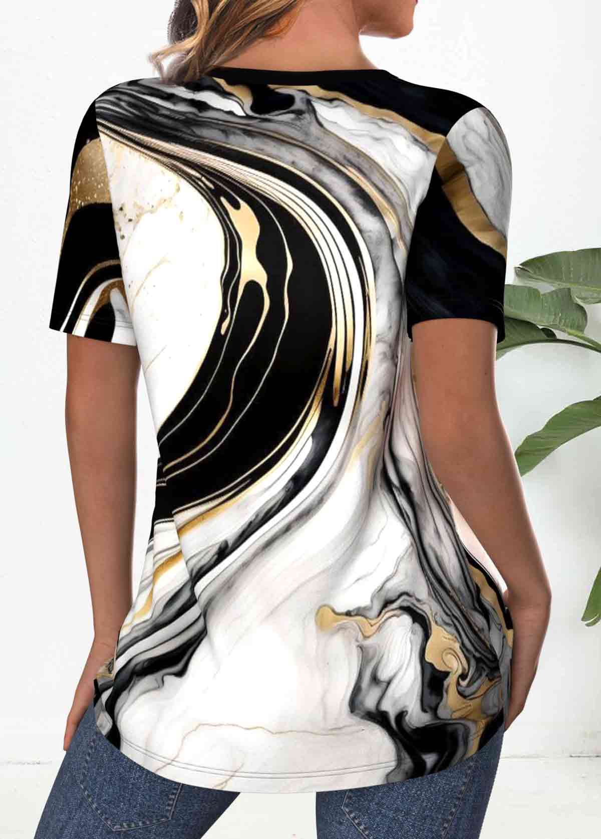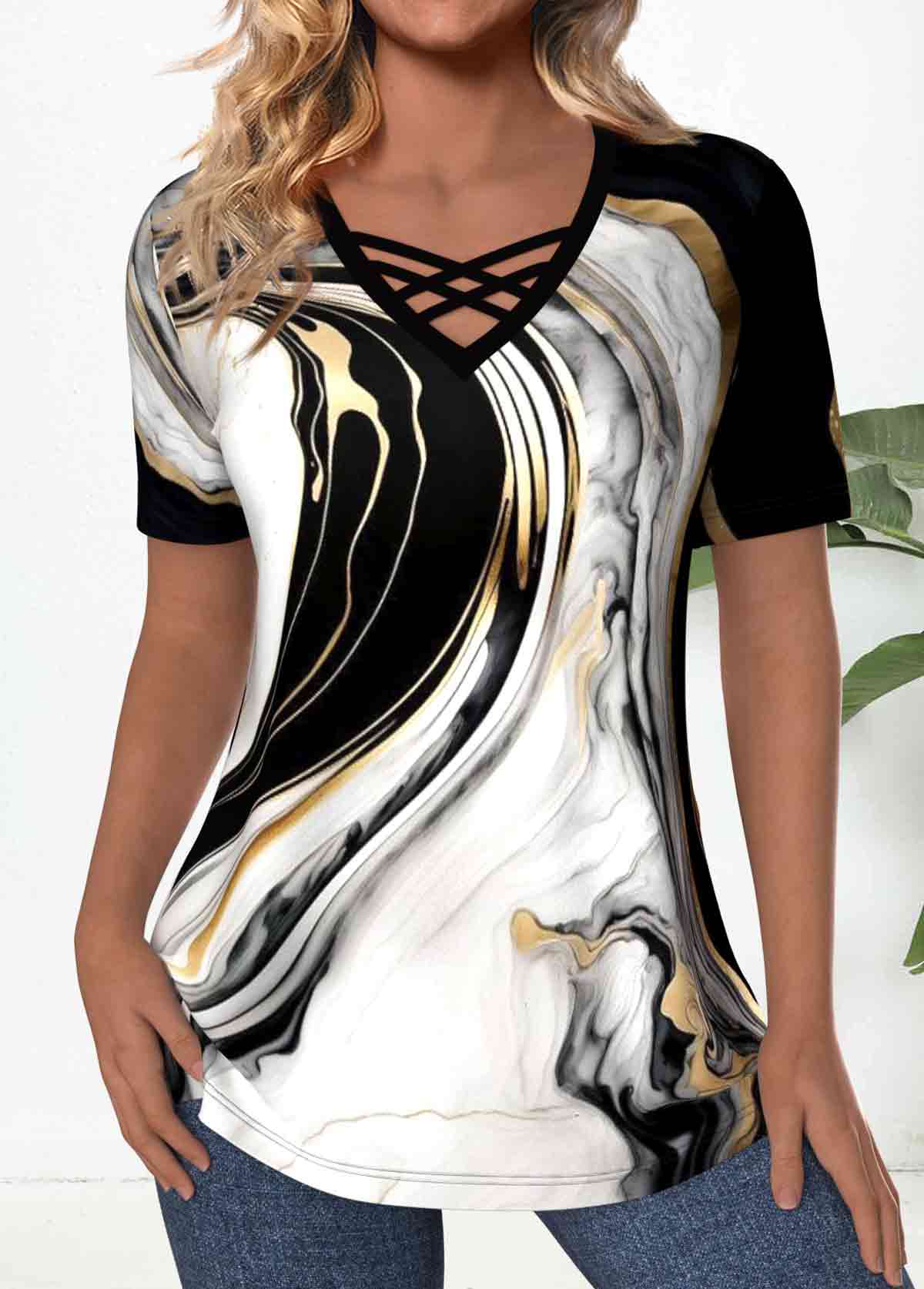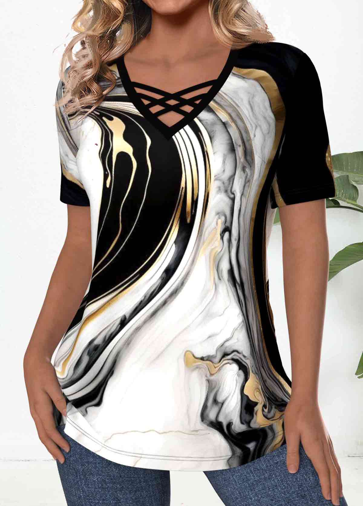 SALE Marble Print Criss Cross Black Short Sleeve T Shirt Rosewe®