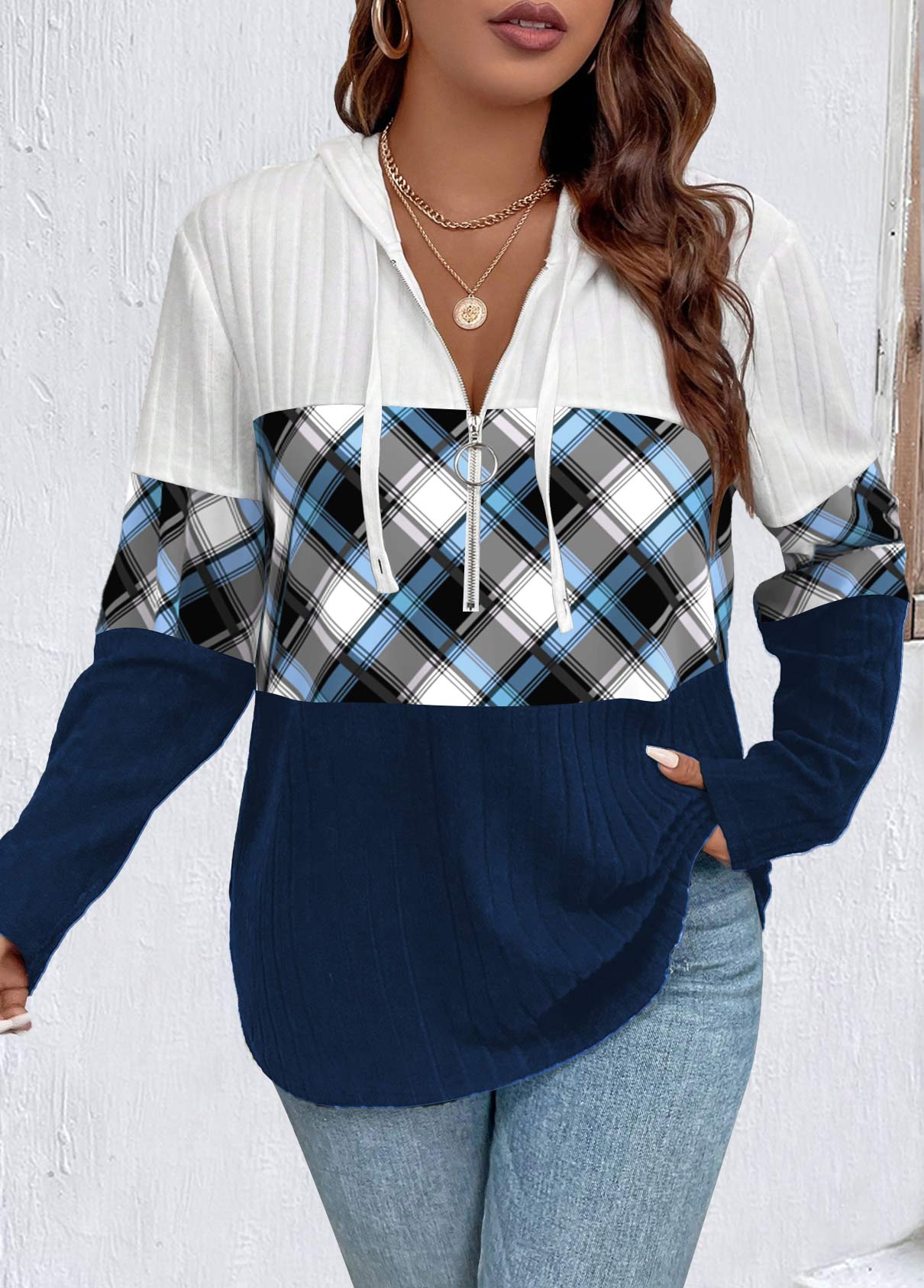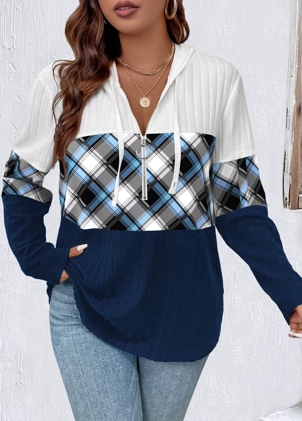 SALE Navy Plus Size Zipper Plaid Long Sleeve Hoodie Rosewe®