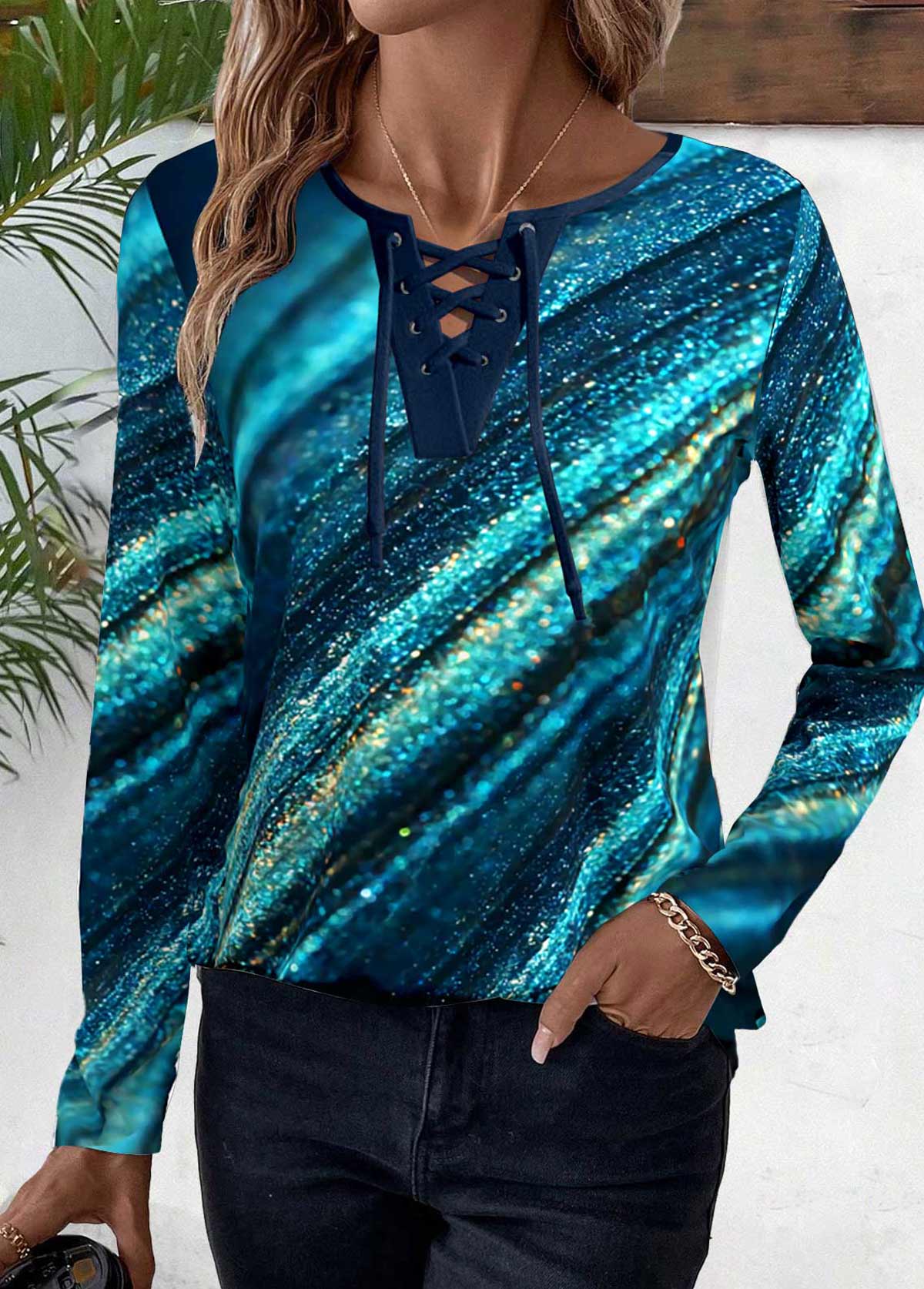 SALE Ombre Lace Up Peacock Blue Long Sleeve T Shirt Rosewe®