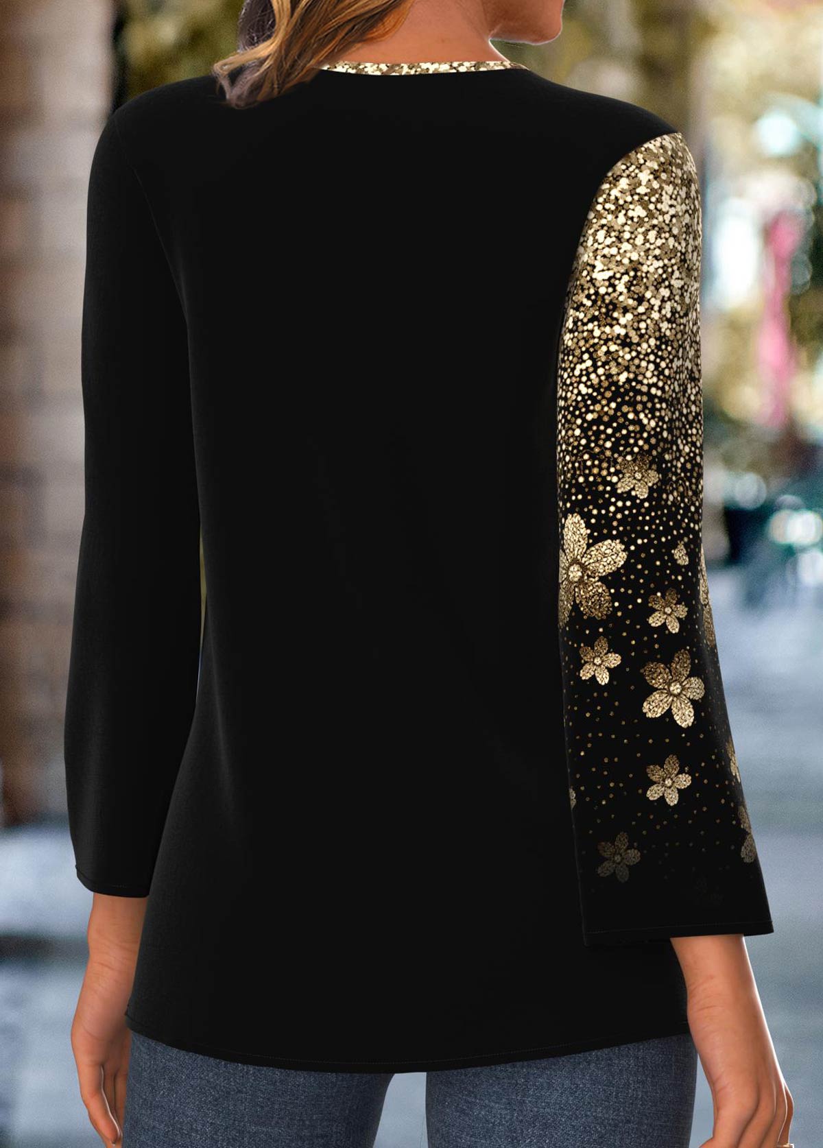 SALE Ombre Patchwork Black Long Sleeve Split Neck Blouse Rosewe®