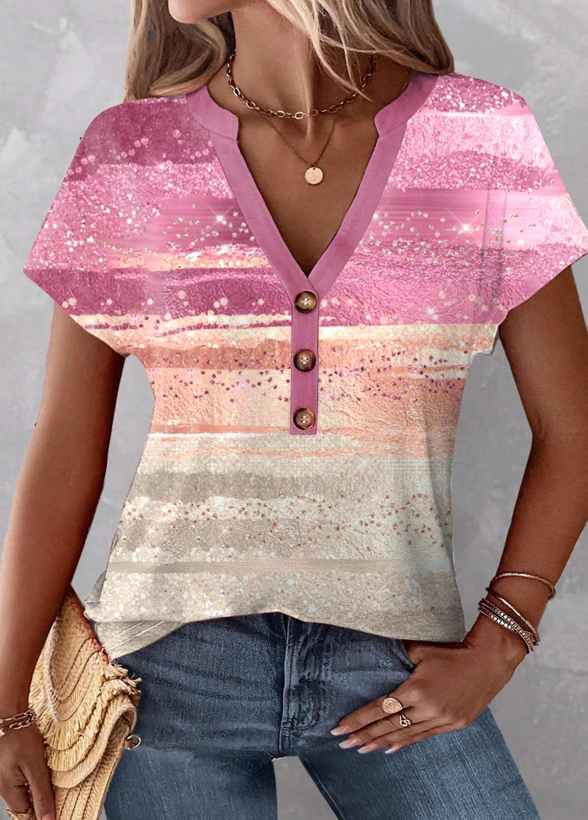 SALE Ombre Patchwork Pink Short Sleeve V Neck T Shirt Rosewe®