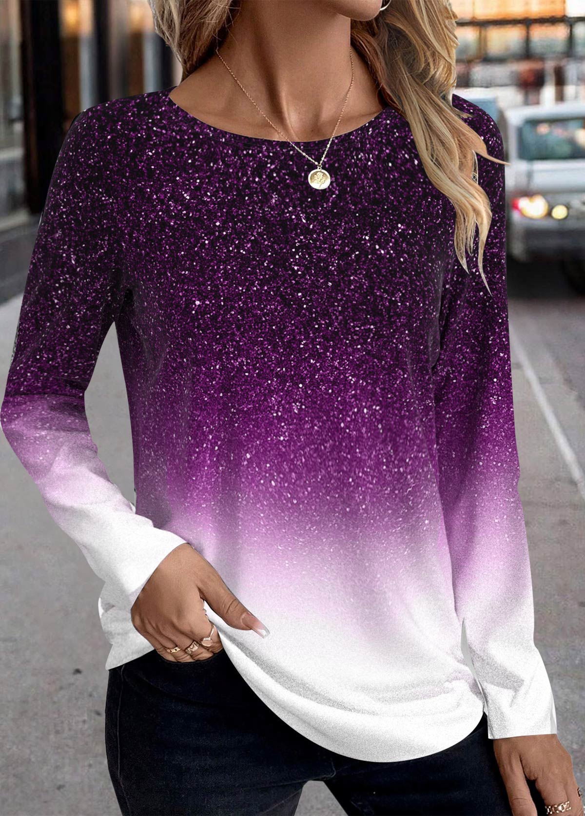 SALE Ombre Patchwork Purple Long Sleeve Round Neck T Shirt Rosewe®