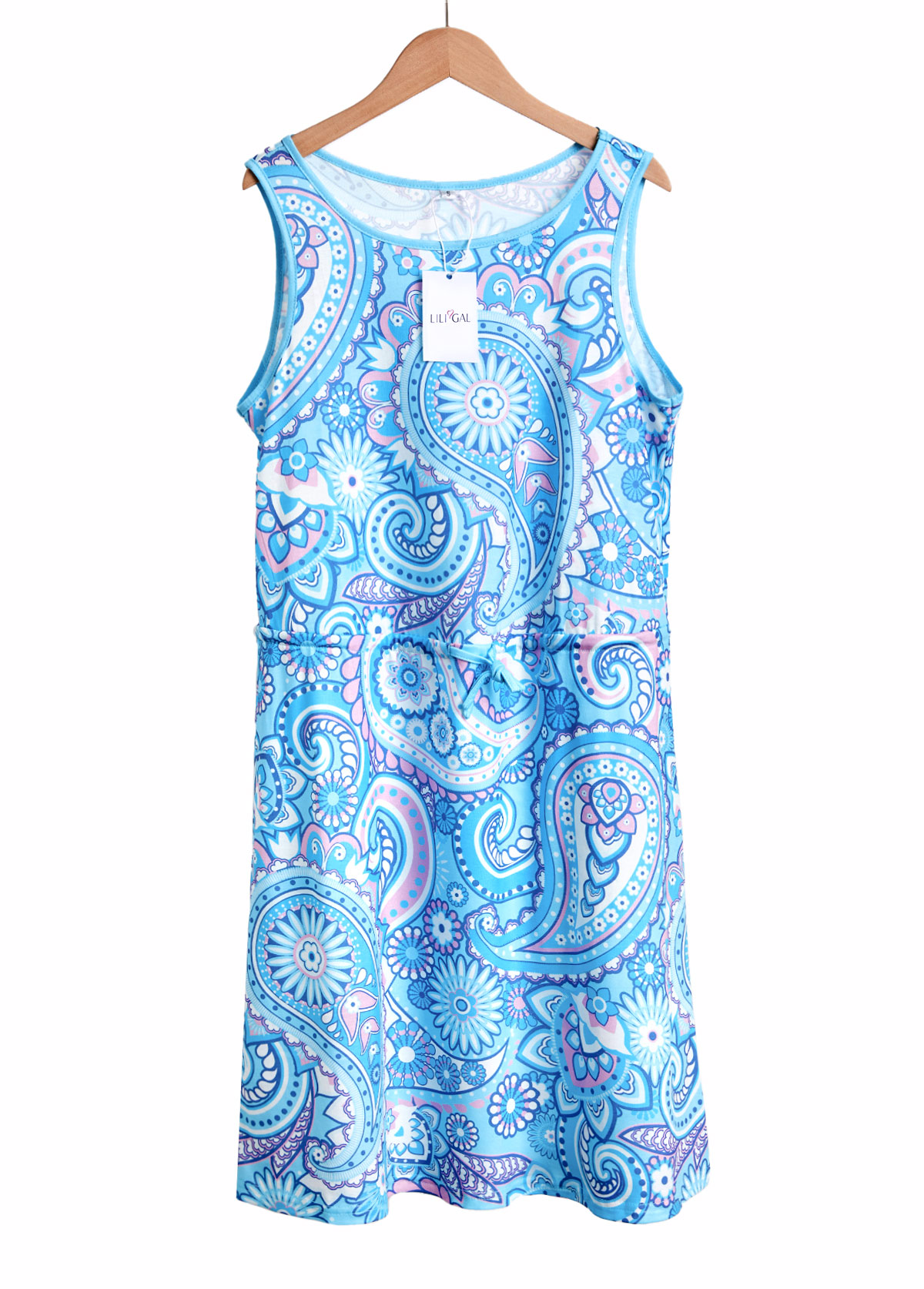 Paisley Print Drawstring Light Blue Short Sleeveless Dress