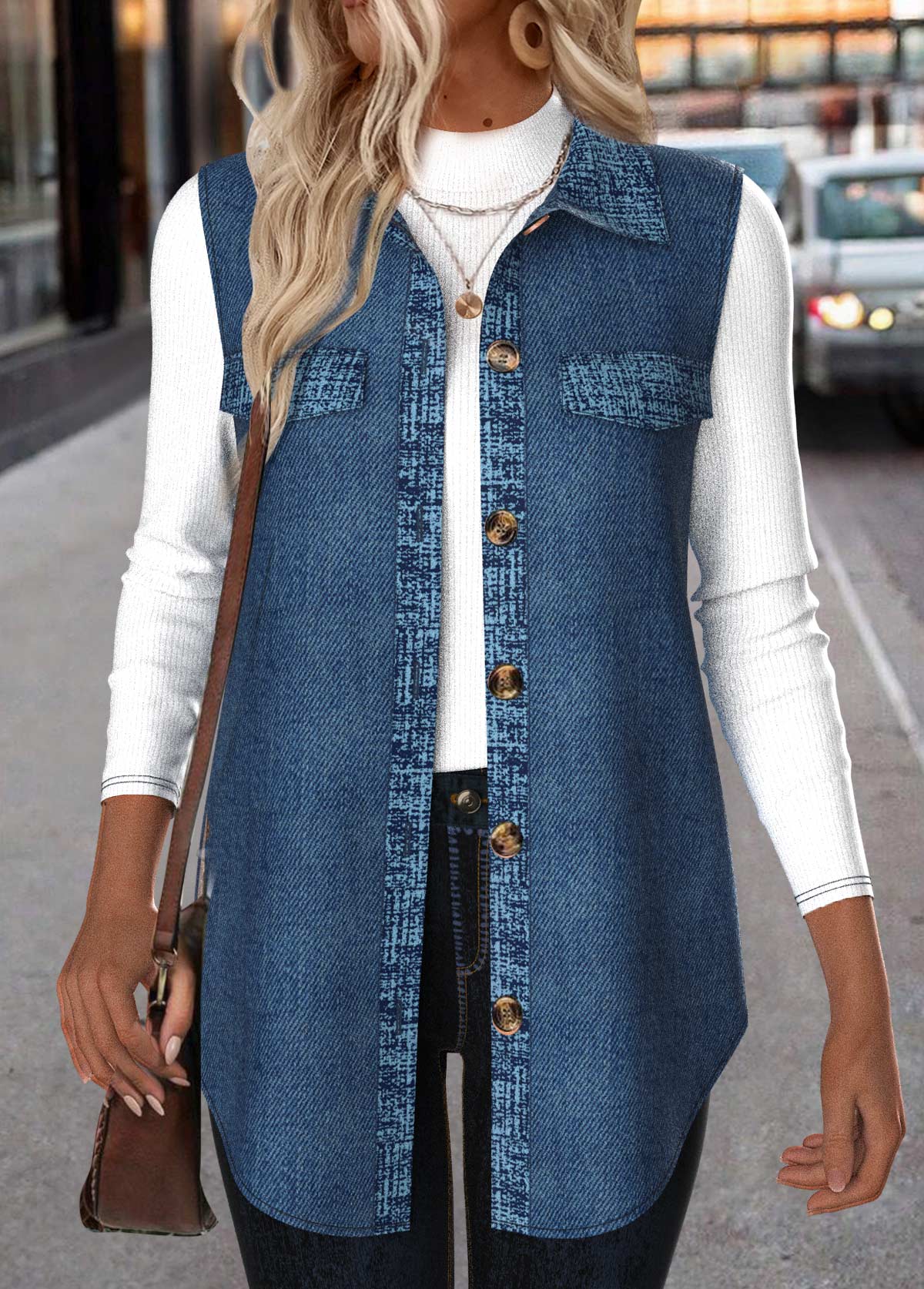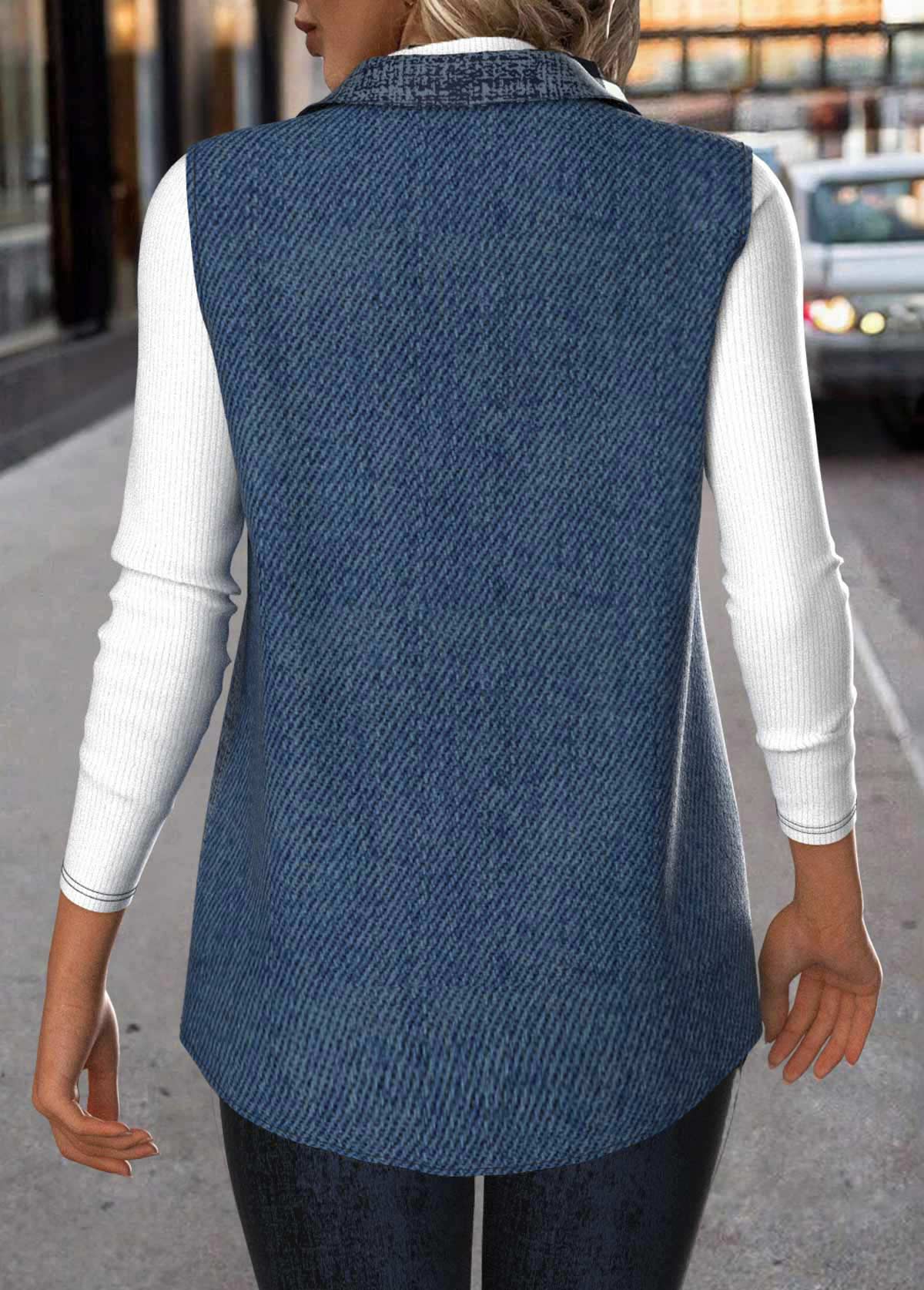 Patchwork Denim Blue Sleeveless Shirt Collar Waistcoat Rosewe®