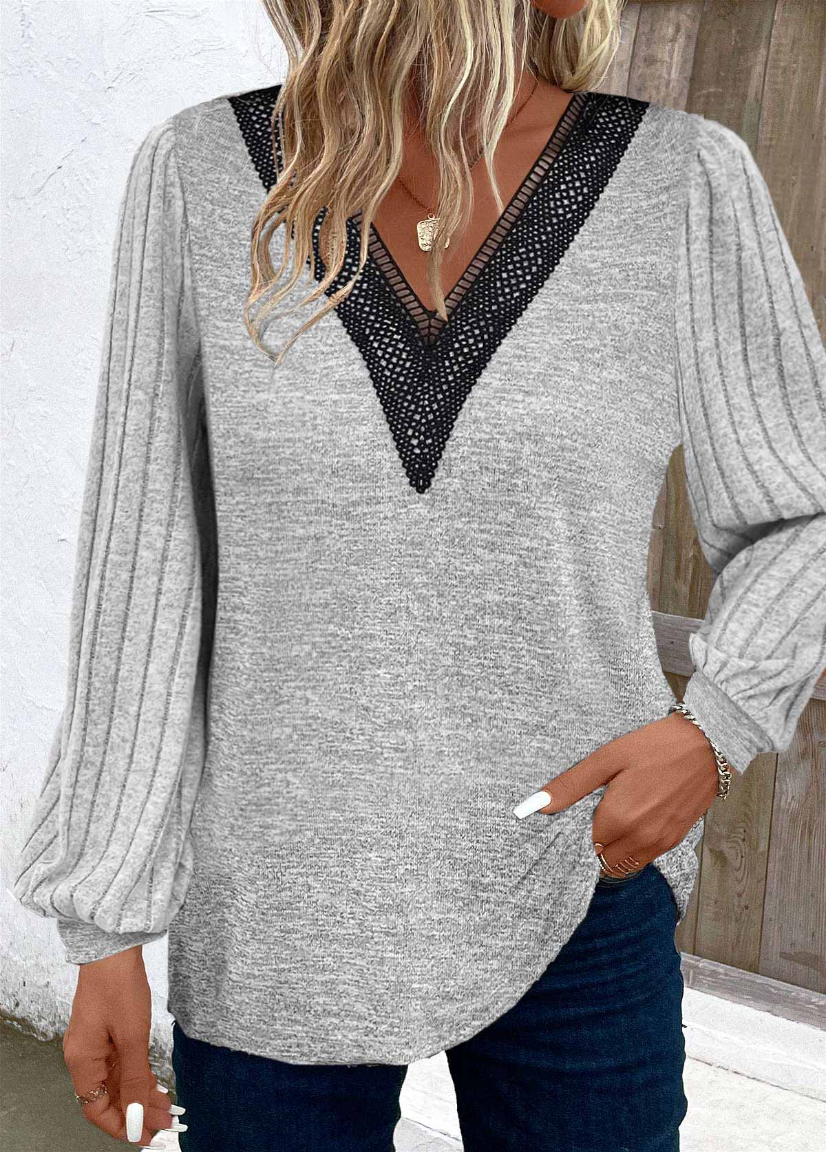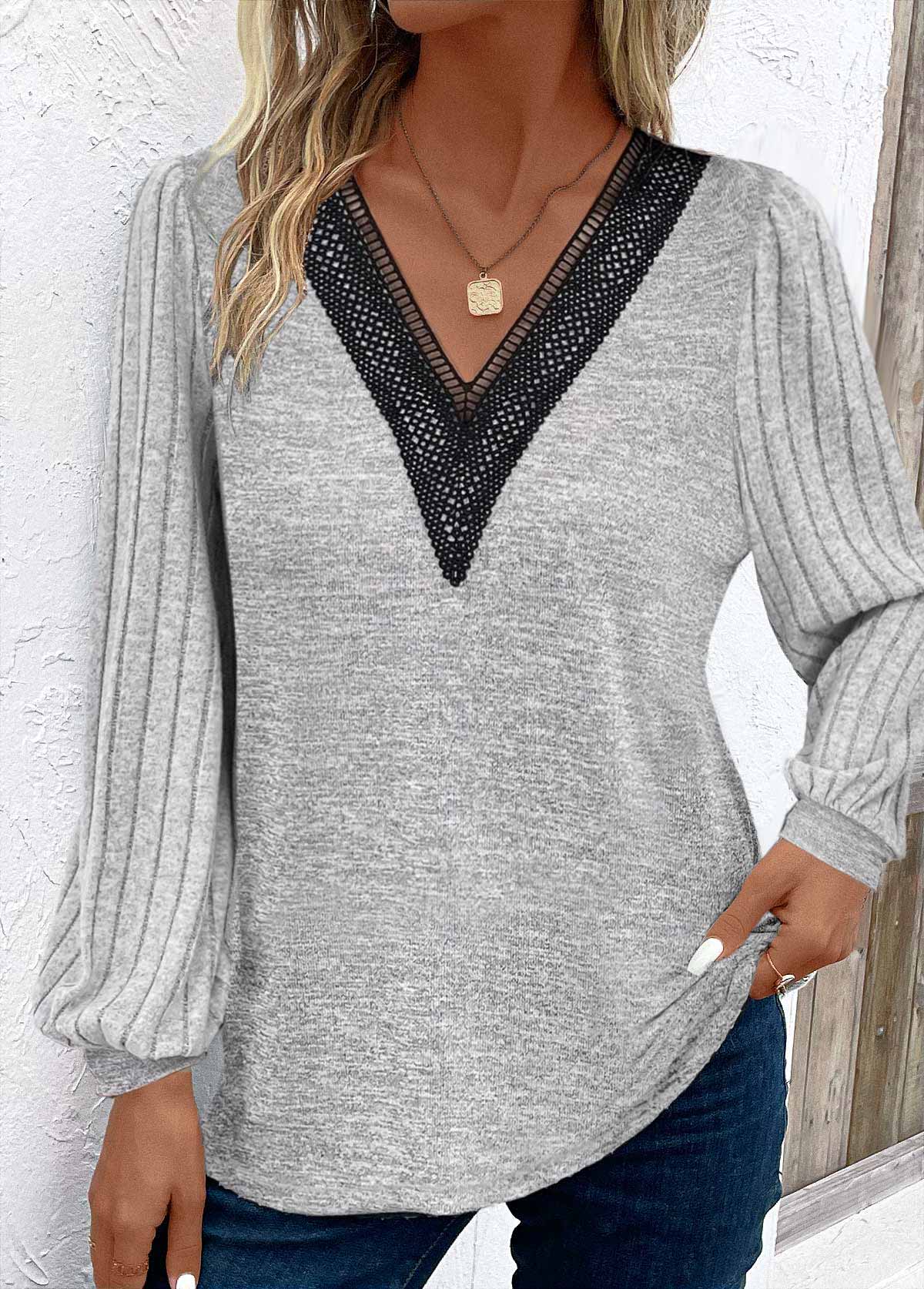 SALE Patchwork Light Grey Long Sleeve V Neck T Shirt Rosewe®