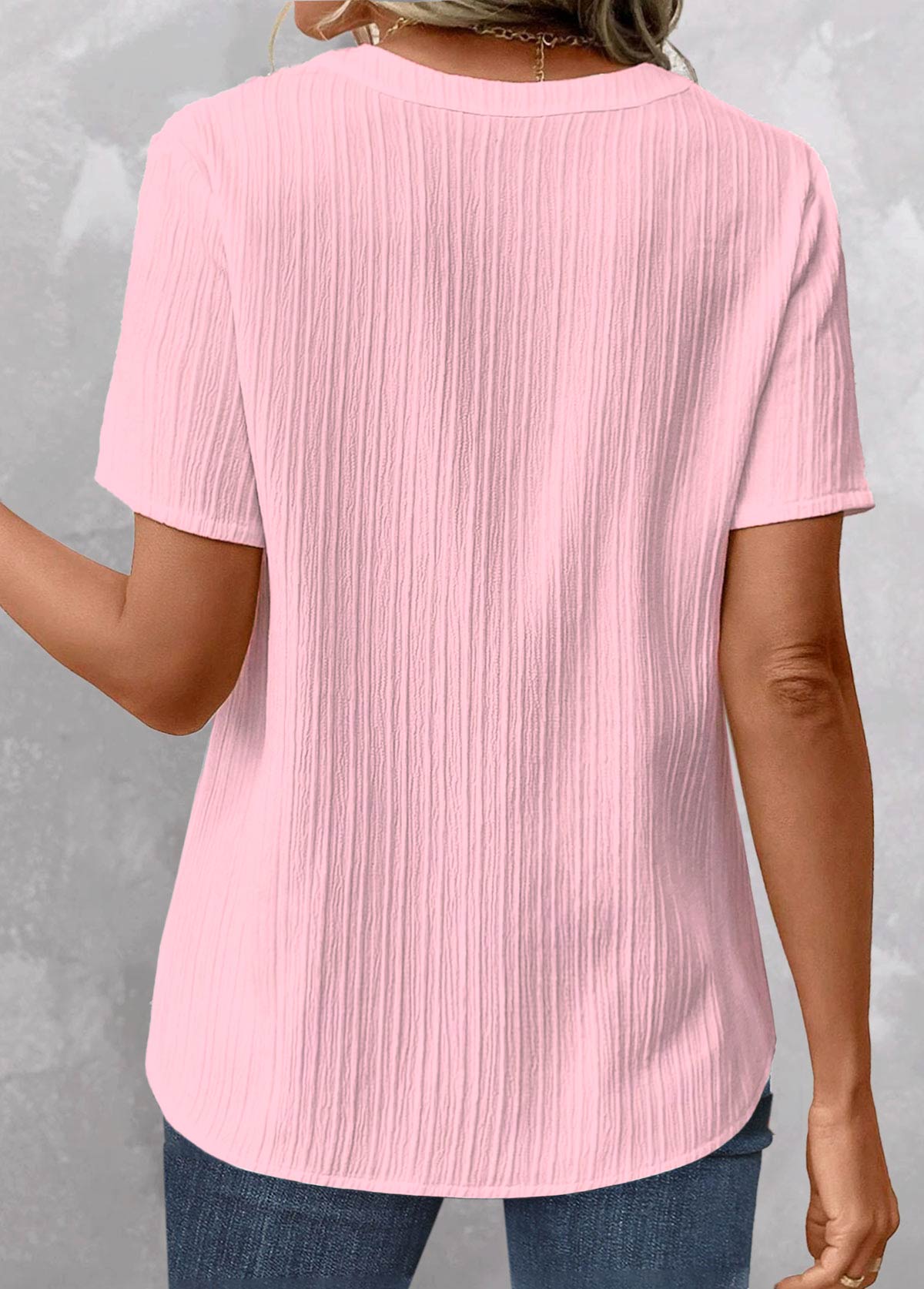SALE Patchwork Light Pink Short Sleeve V Neck Blouse Rosewe®