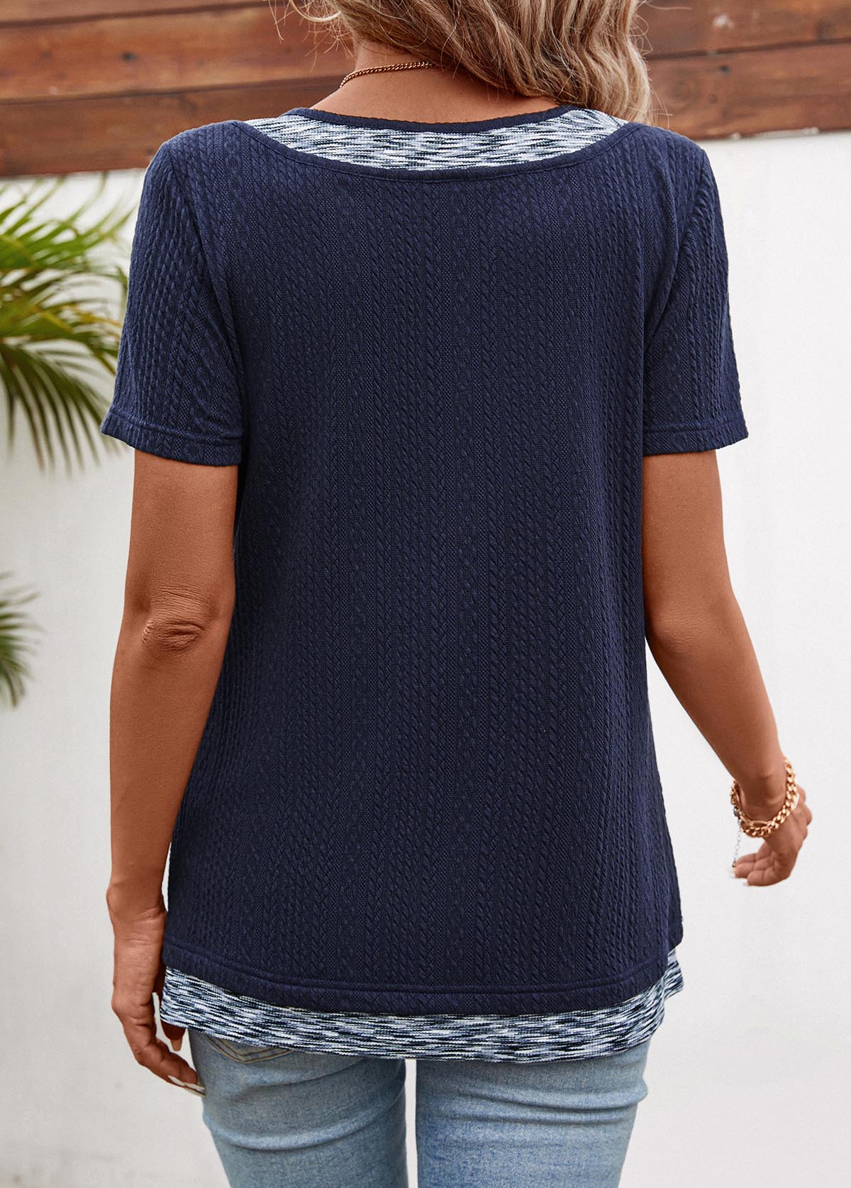 SALE Patchwork Navy Short Sleeve Split Neck T Shirt Rosewe®