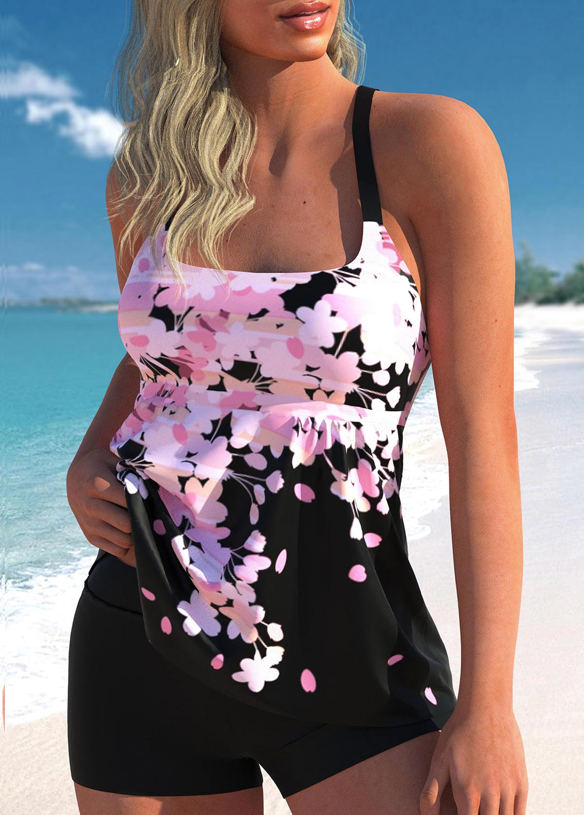 • Pink Floral Print Wide Strap Tankini Top-No Bottom