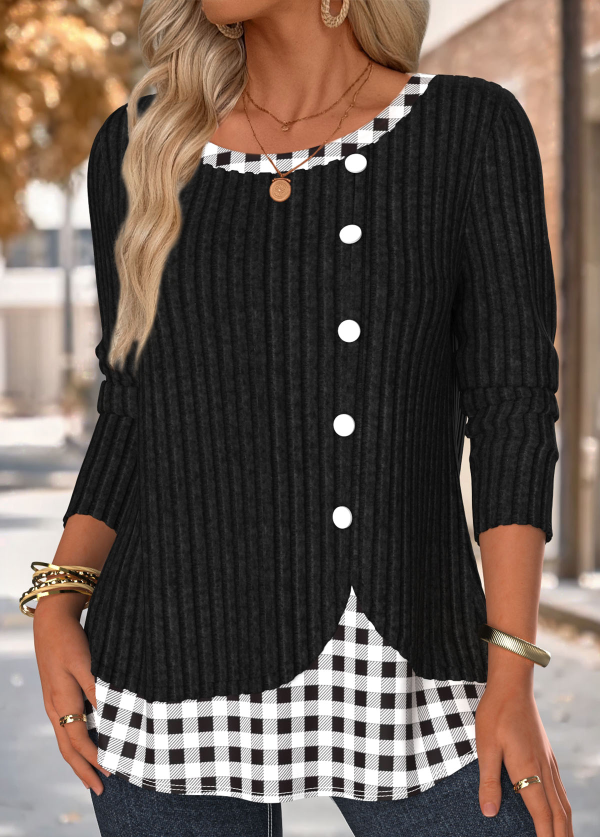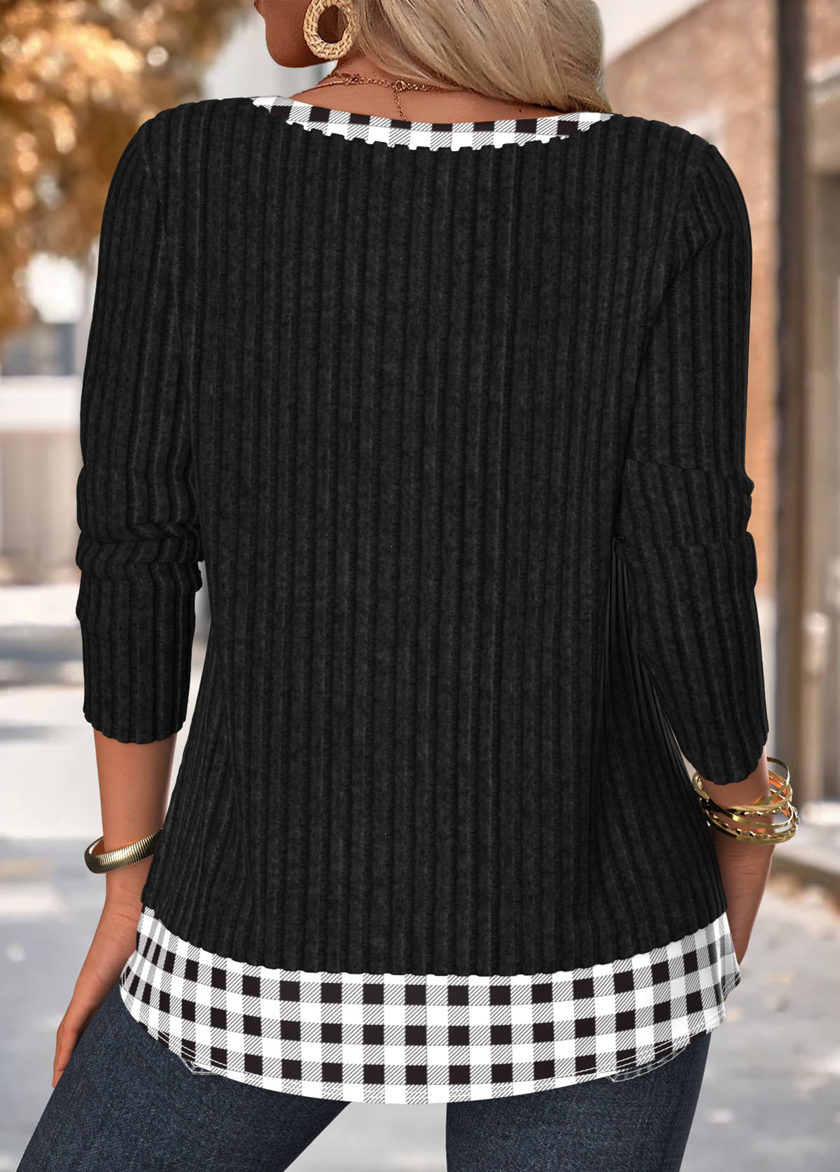 Plaid Black Long Sleeve Round Neck T Shirt Rosewe®