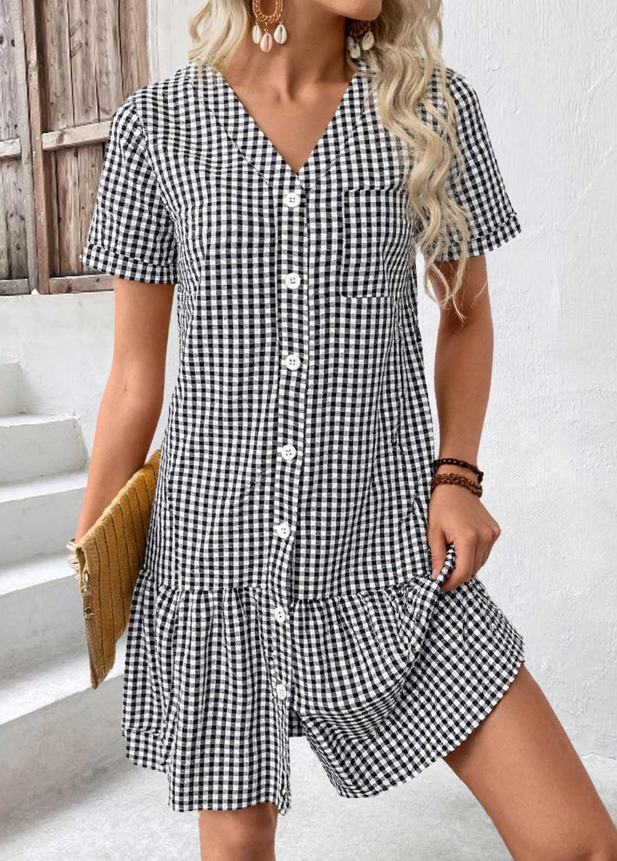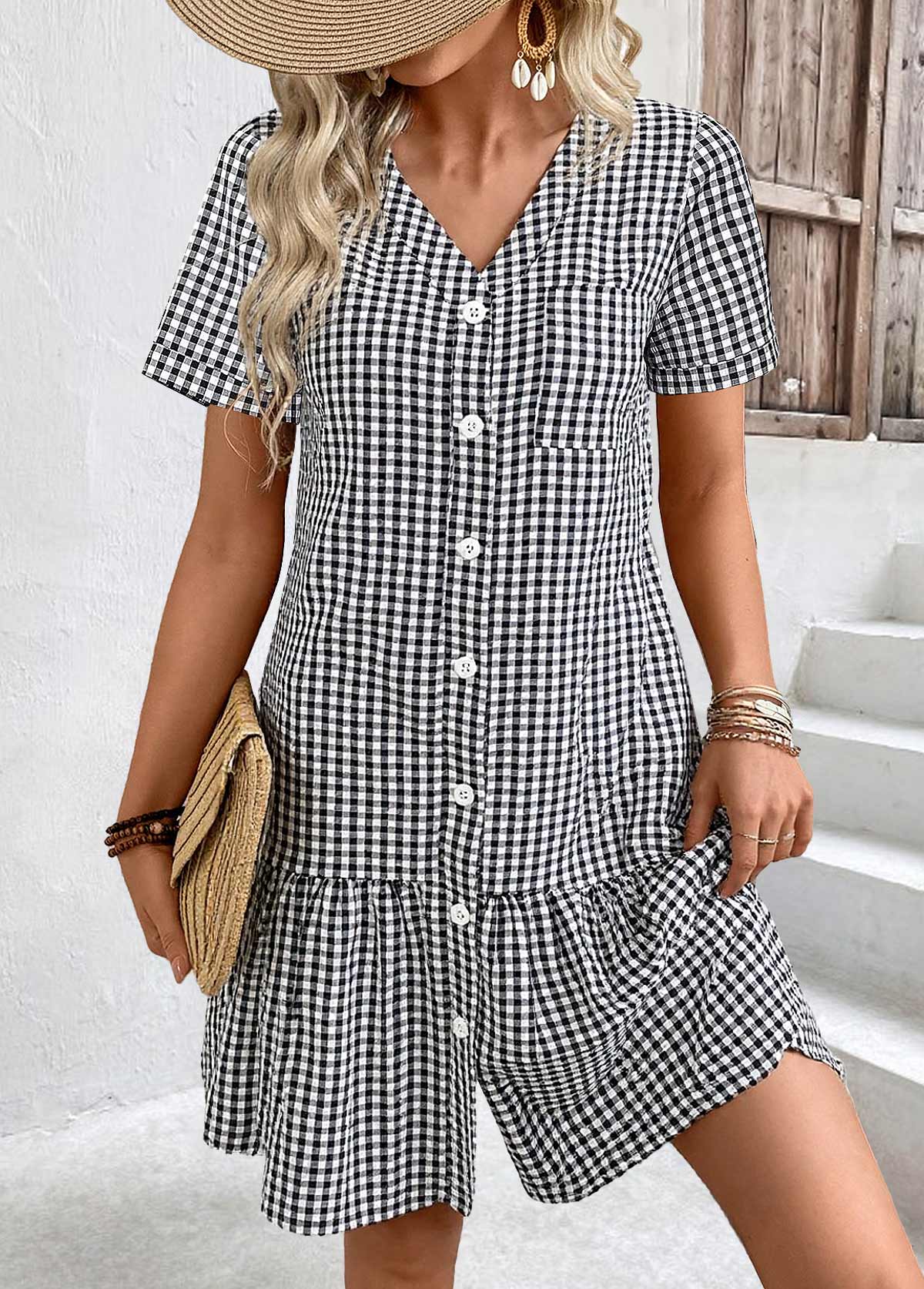 SALE Plaid Black Short Sleeve V Neck Dress Rosewe®