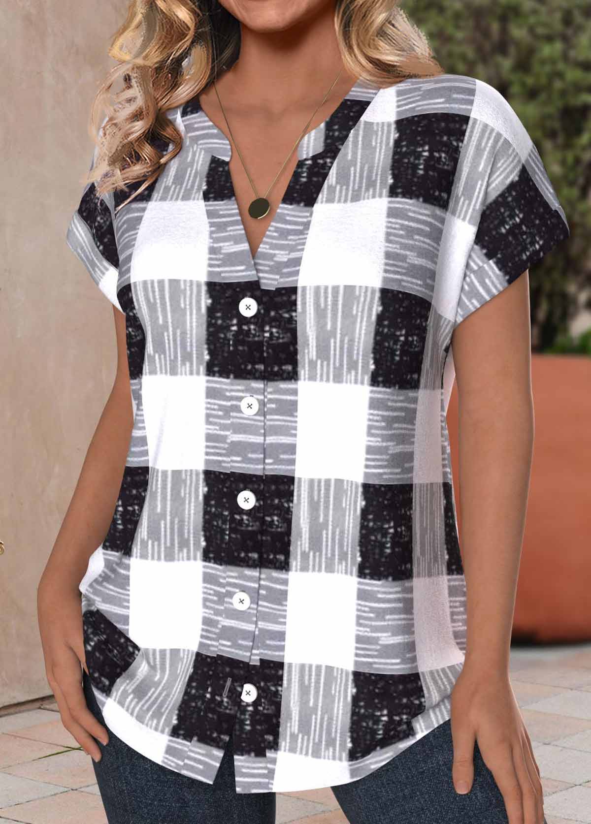 • Plaid Button Black Short Sleeve V Neck Blouse