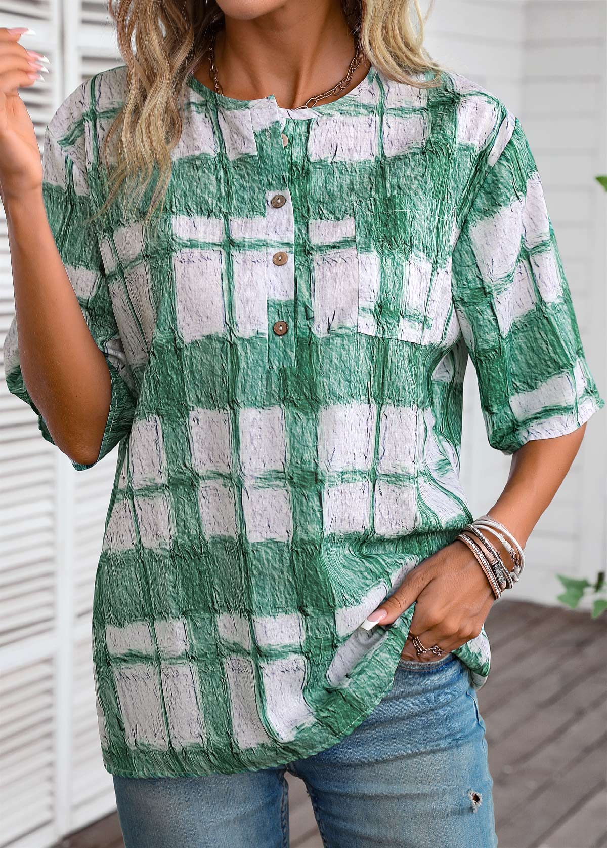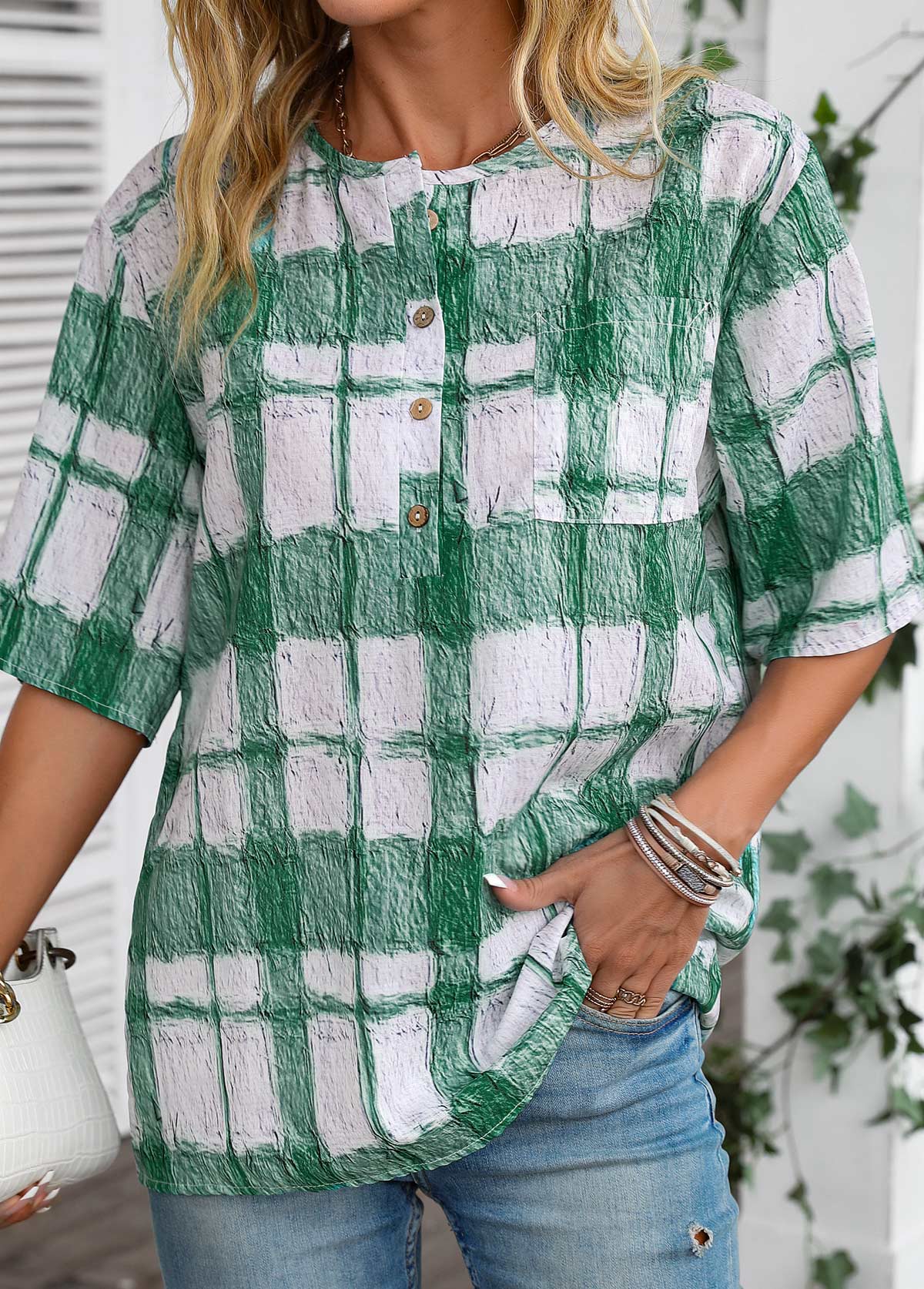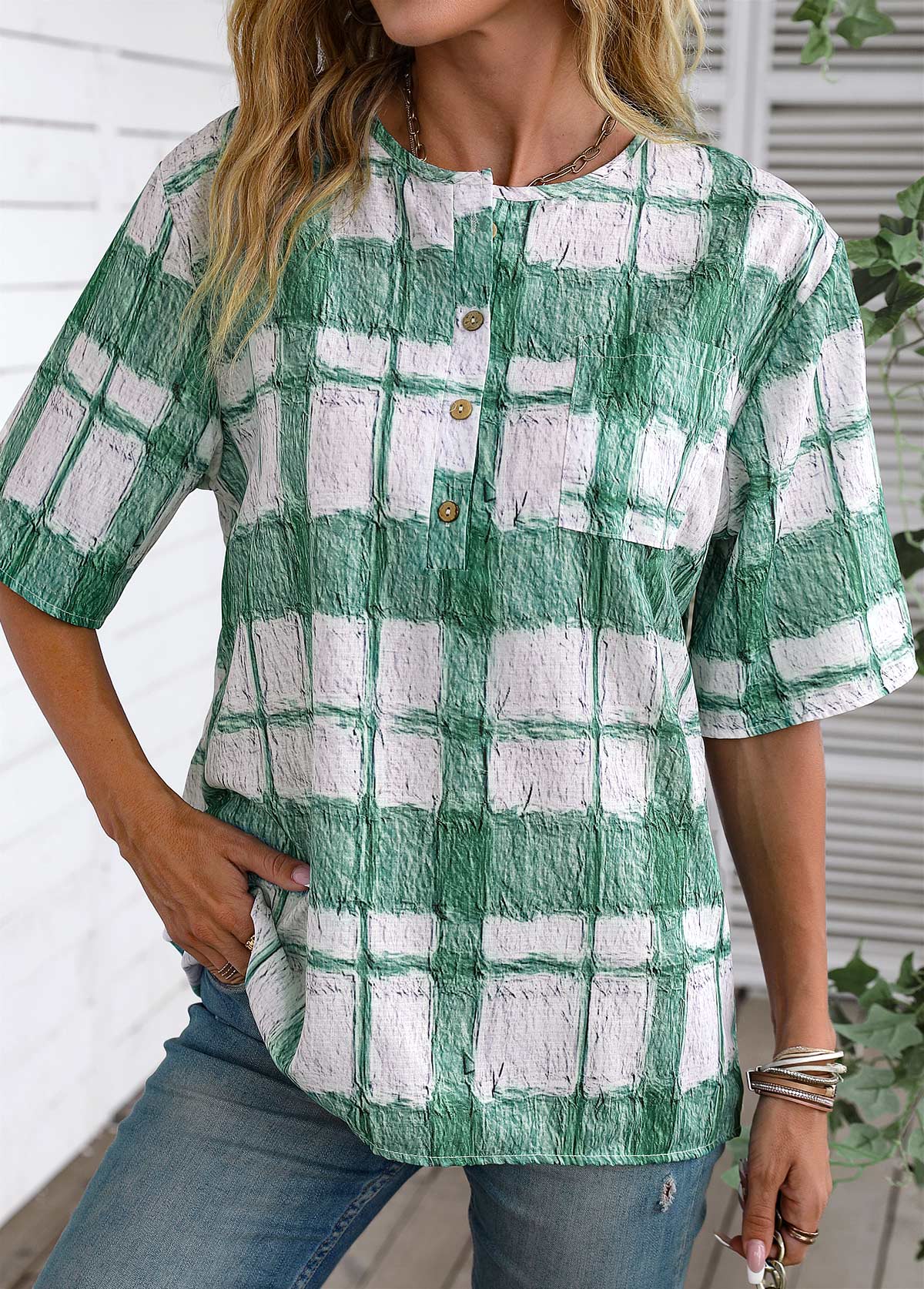 • Plaid Button White Round Neck Half Sleeve Blouse