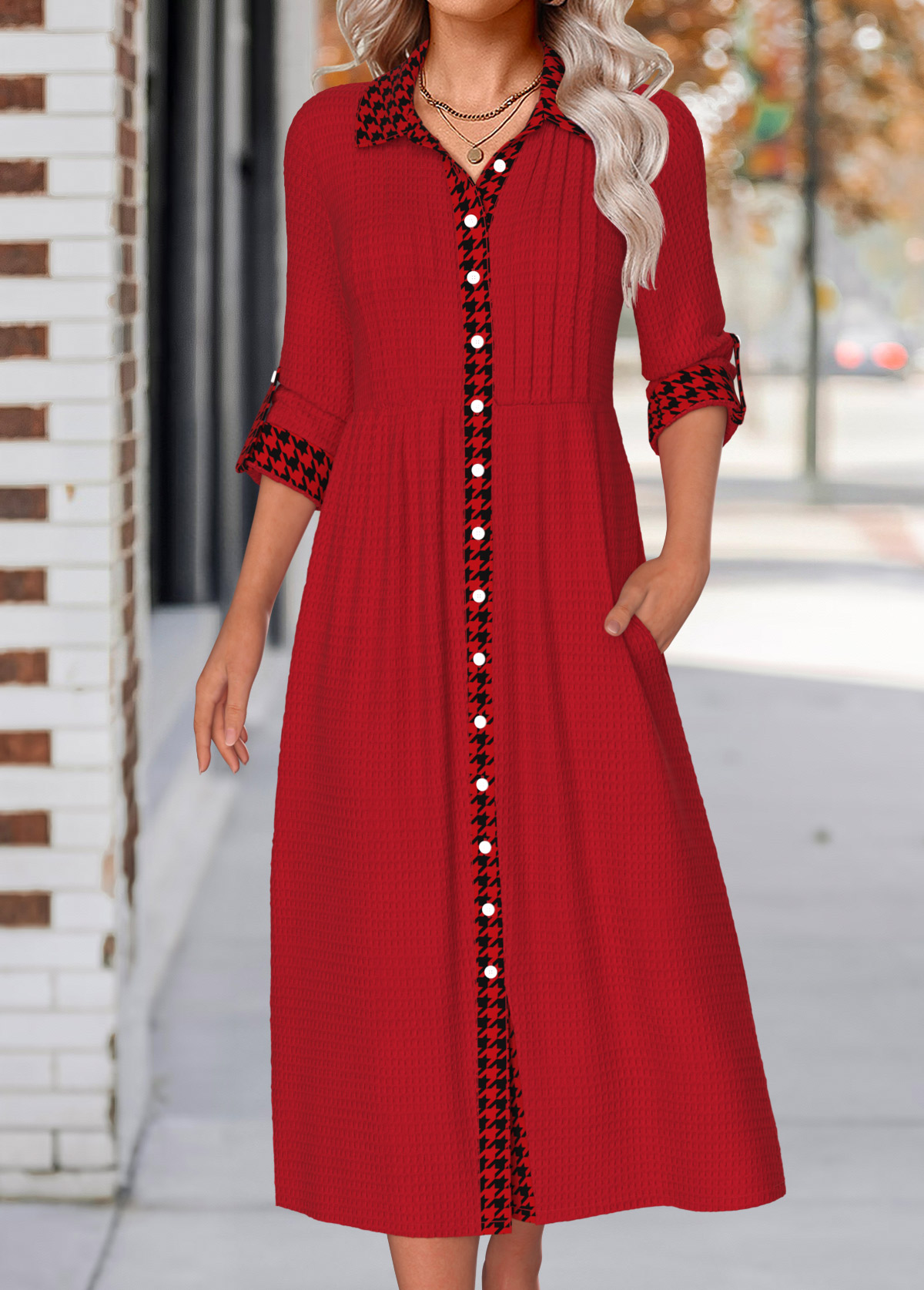 Plaid Button Wine Red Long Sleeve Shirt Collar Dress Rosewe®