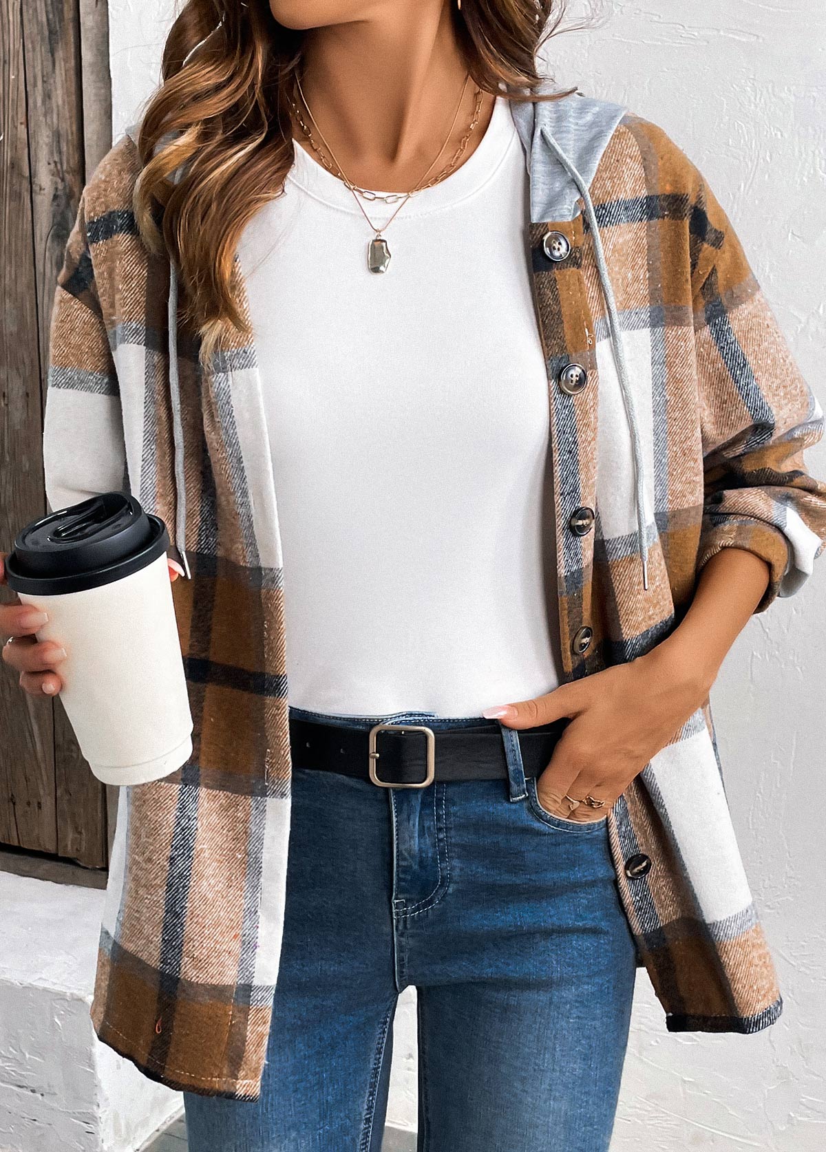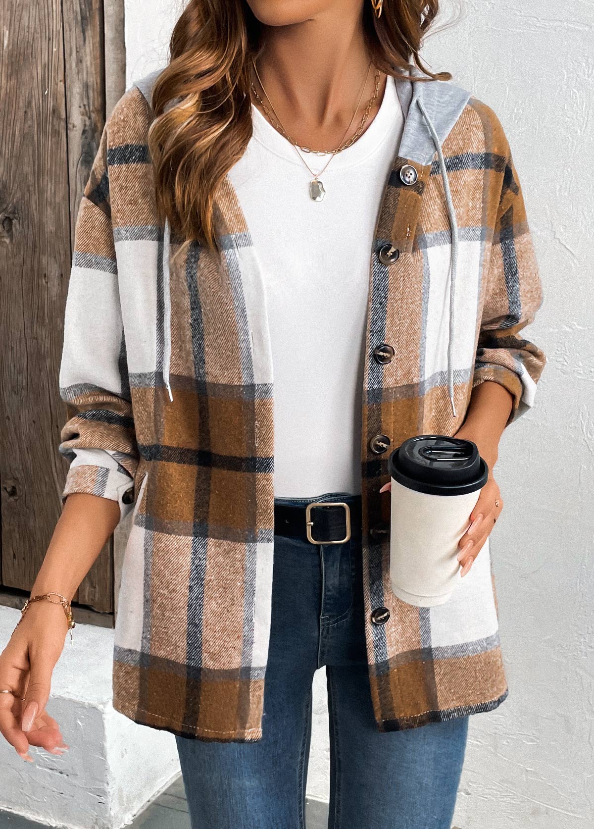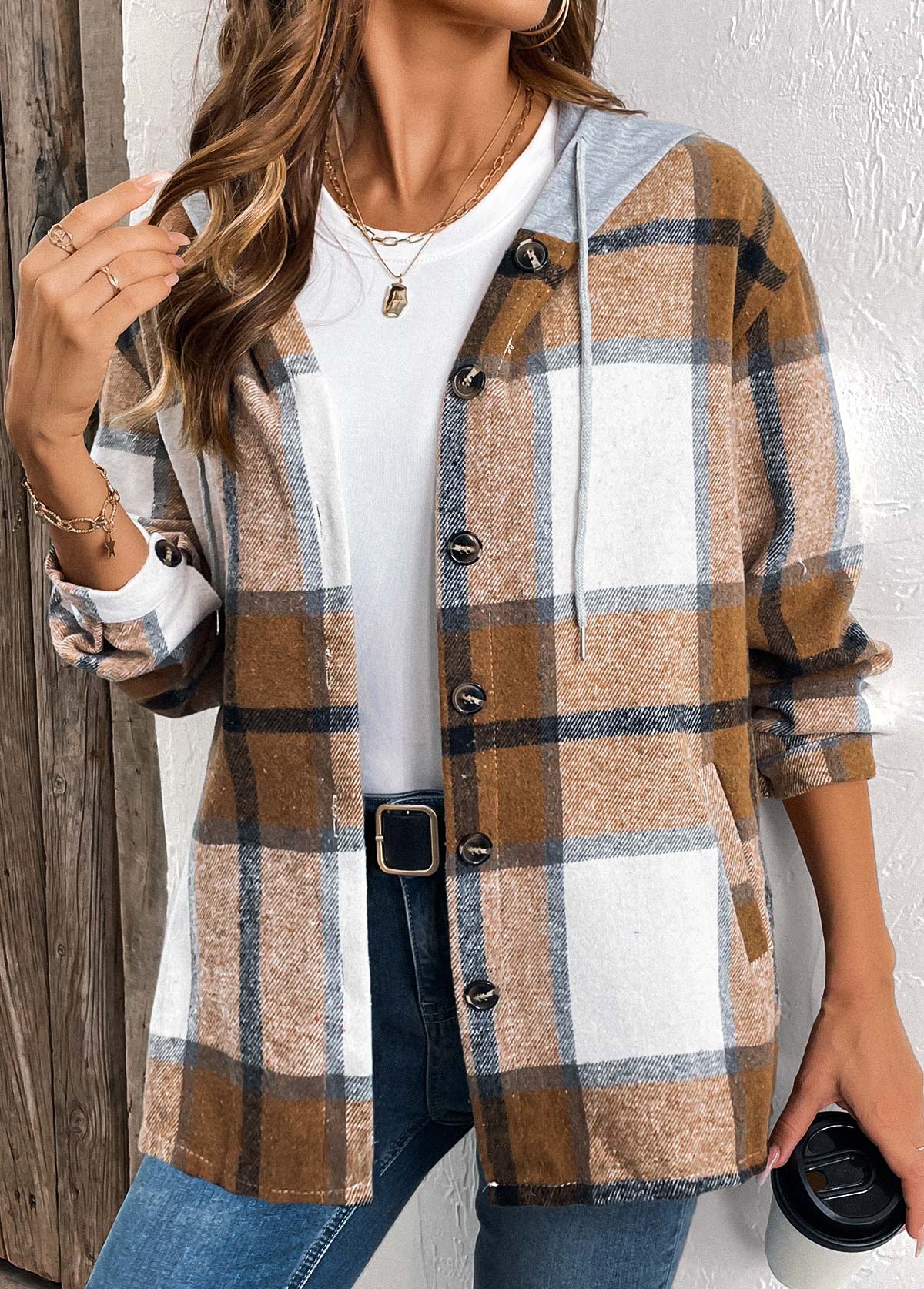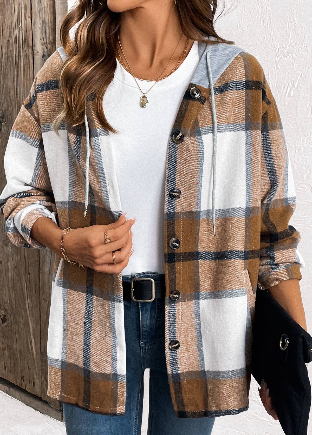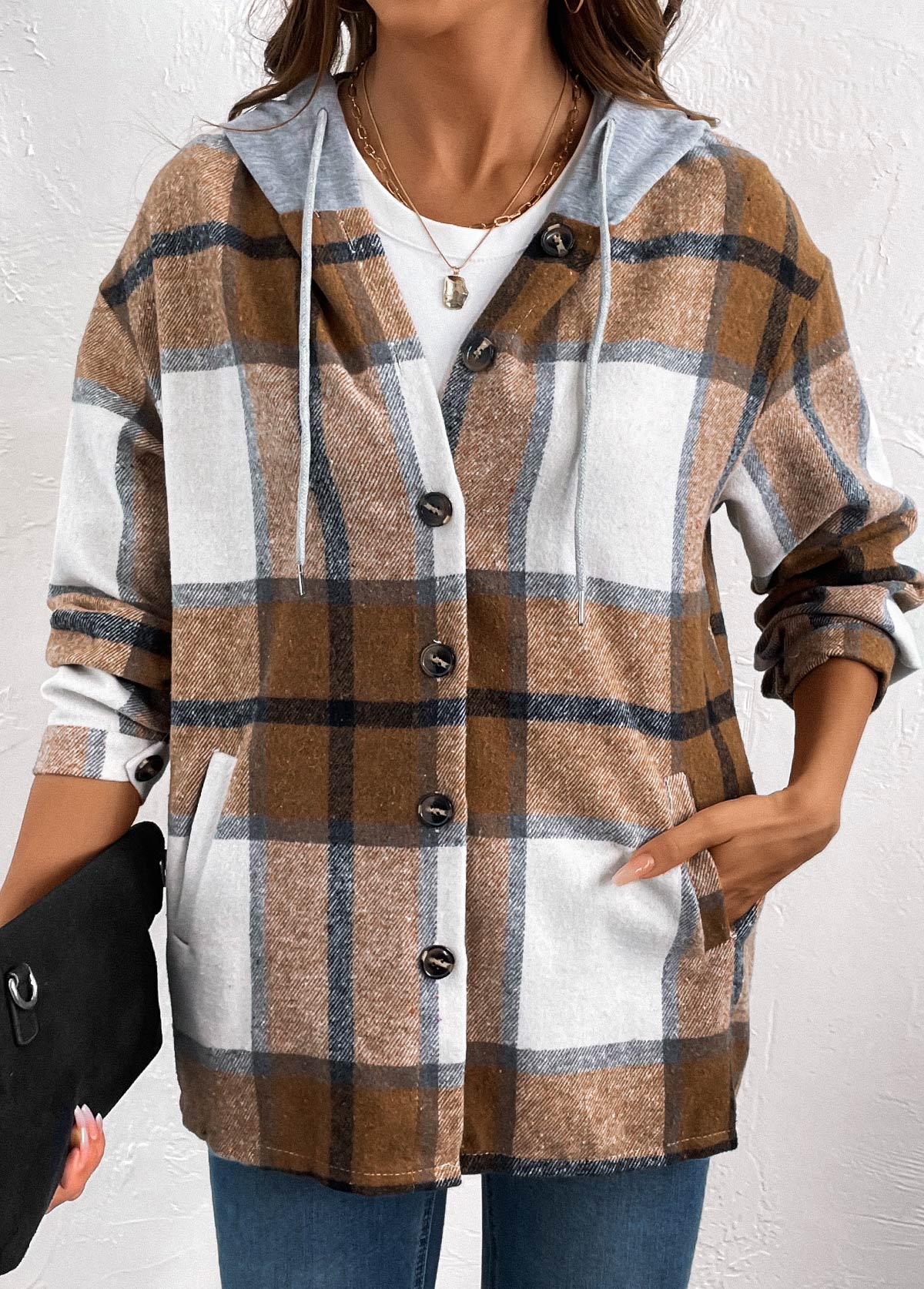 SALE Plaid Drawstring Dark Coffee Long Sleeve Hooded Shirt Rosewe®
