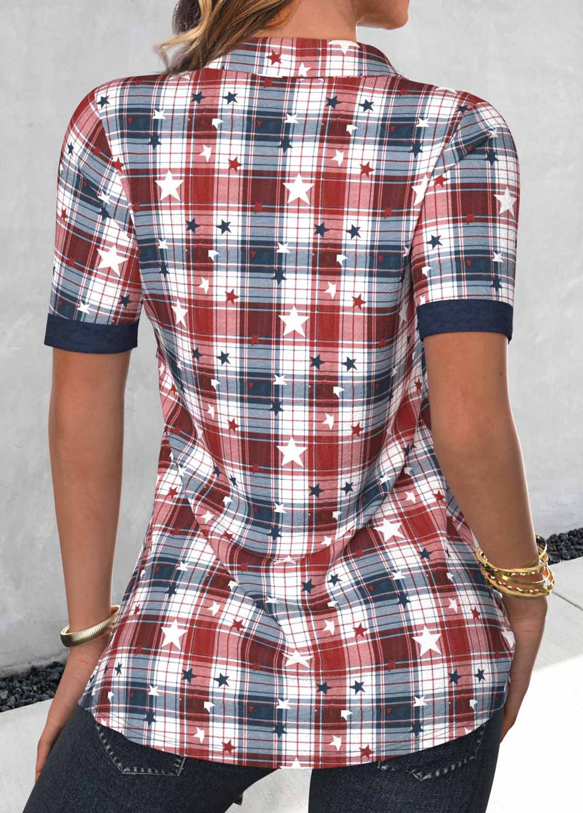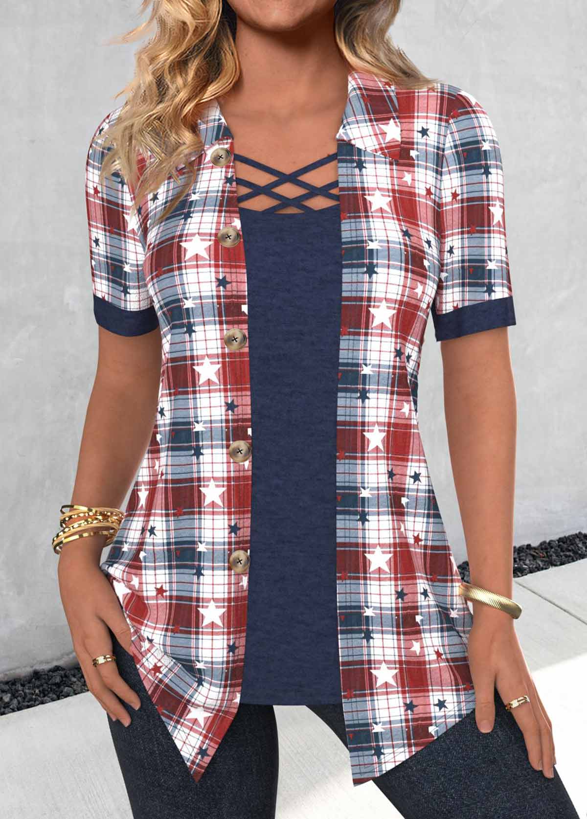 SALE Plaid Fake 2in1 Navy Short Sleeve Shirt Collar Blouse Rosewe®