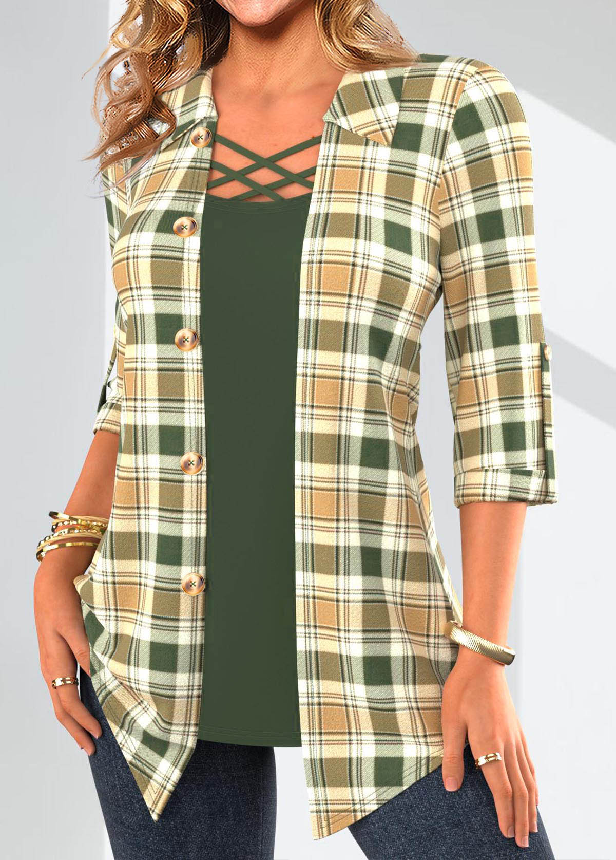 SALE Plaid Fake 2in1 Sage Green Shirt Collar Blouse Rosewe®