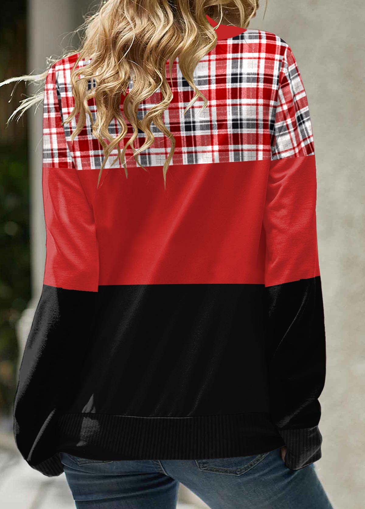 • Plaid Patchwork Red Long Sleeve Cowl Neck Sweatshirt