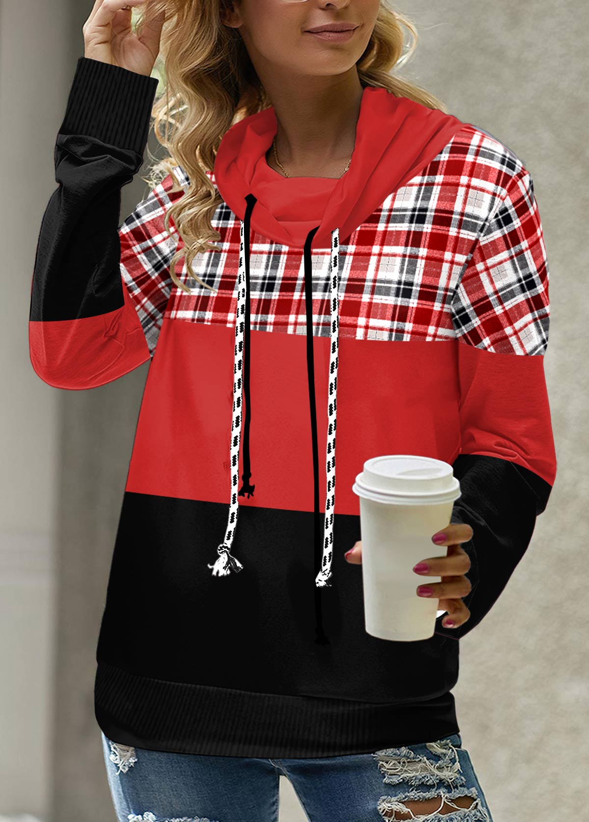 SALE Plaid Patchwork Red Long Sleeve Cowl Neck Sweatshirt Rosewe®