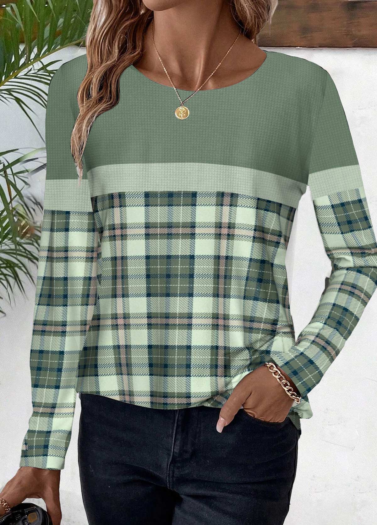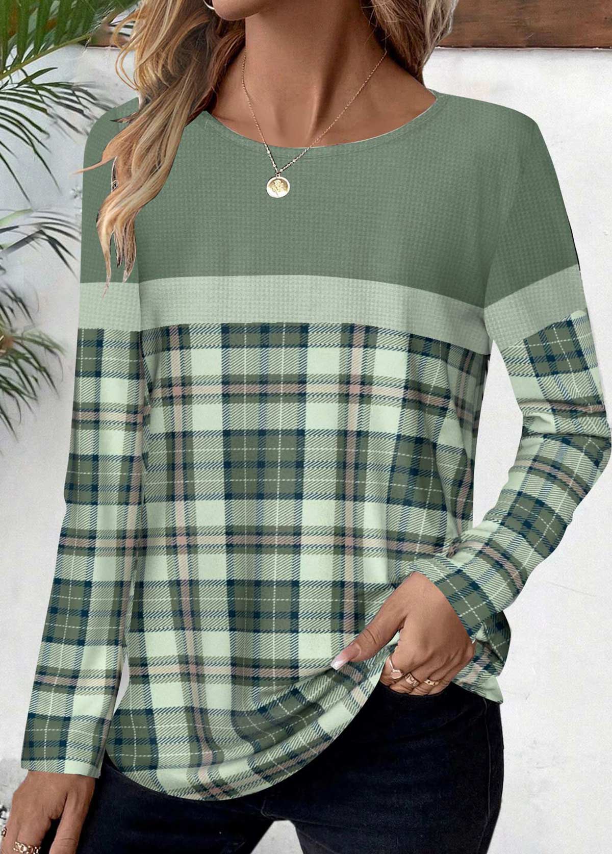 SALE Plaid Patchwork Sage Green Long Sleeve T Shirt Rosewe®