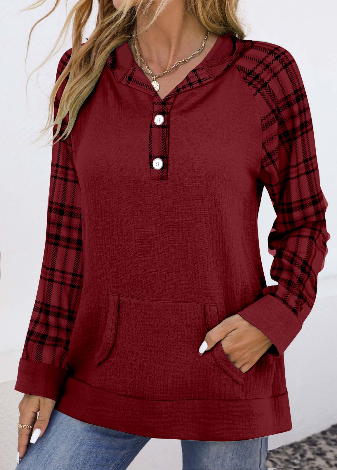 • Plaid Pocket Wine Red Long Sleeve Hoodie