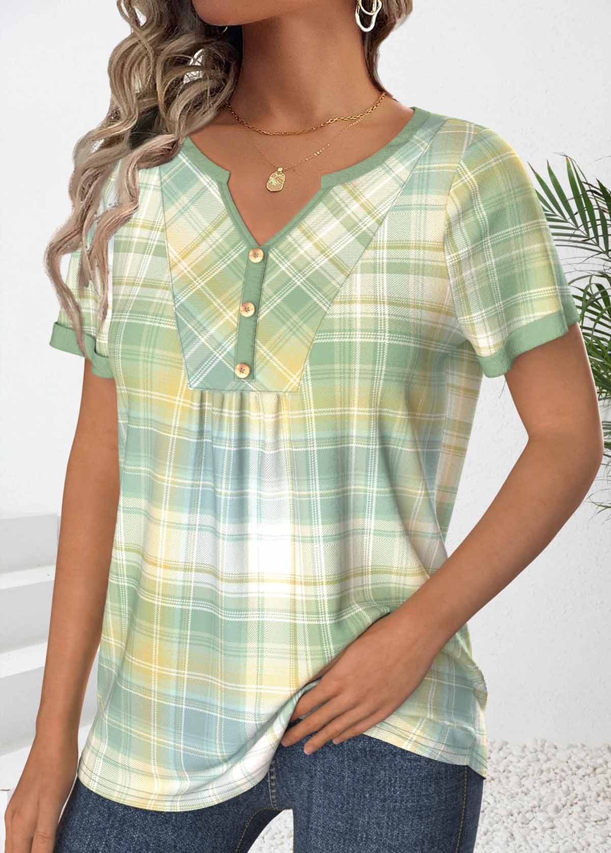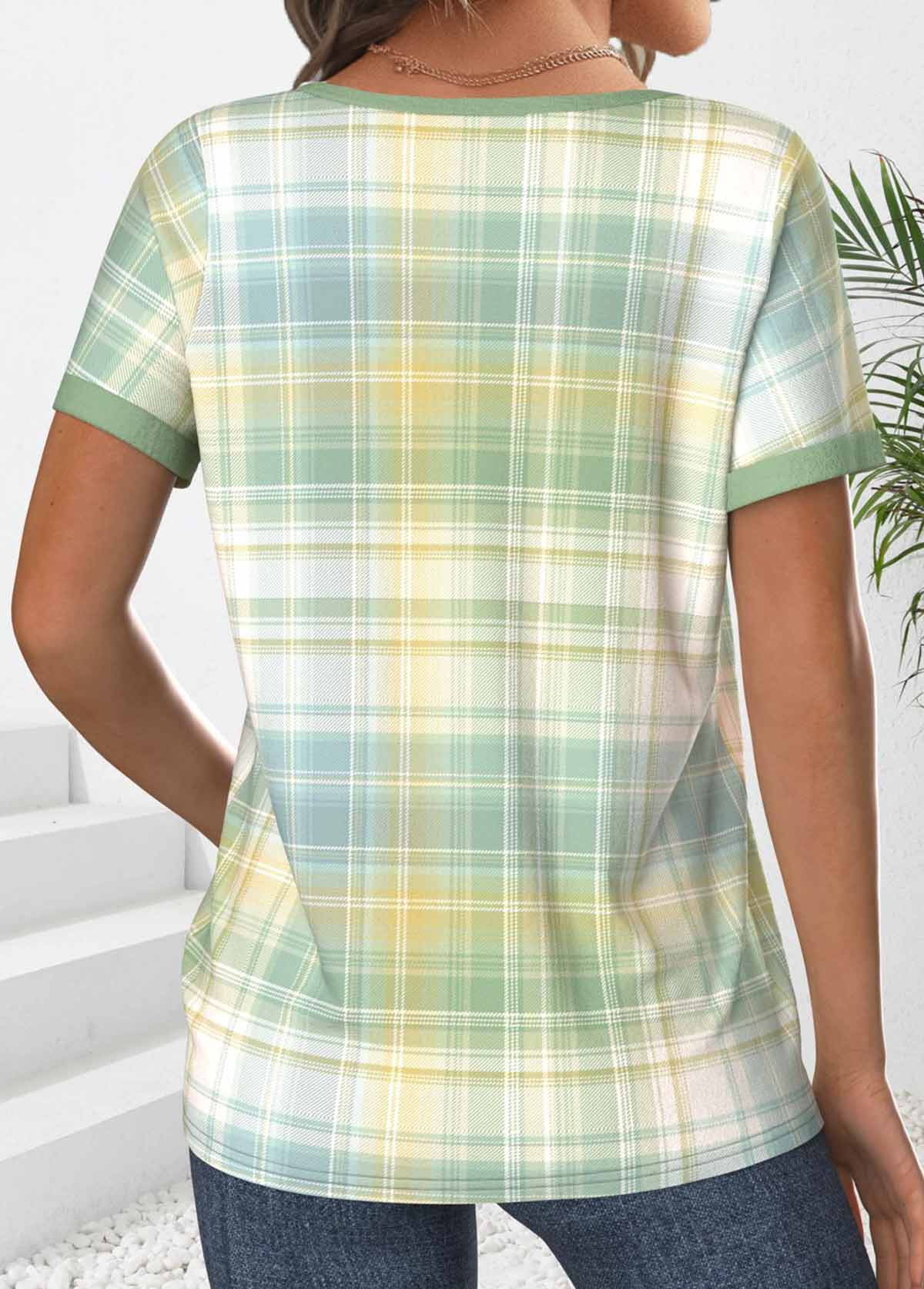 SALE Plaid Ruched Light Green Short Sleeve T Shirt Rosewe®