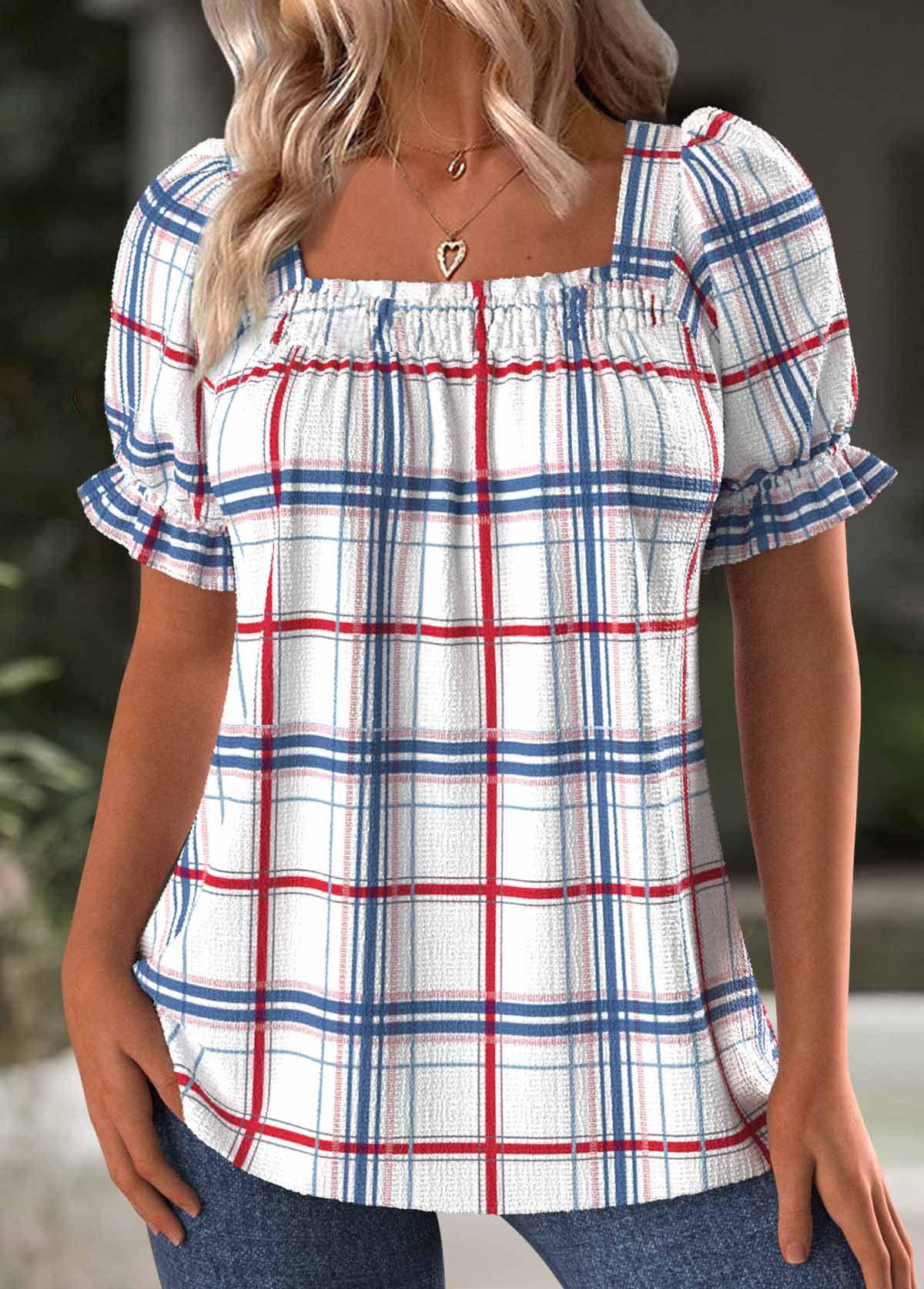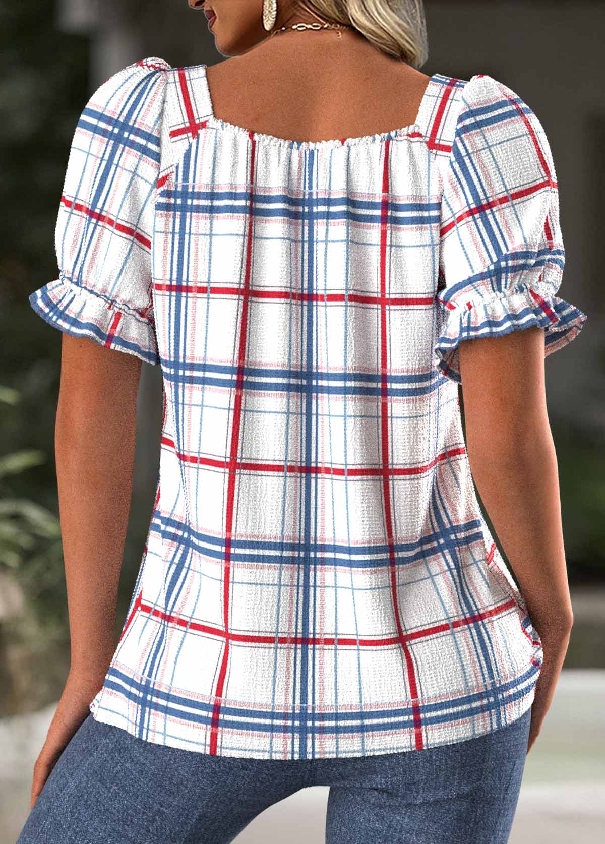 SALE Plaid White Short Sleeve Square Neck T Shirt Rosewe®