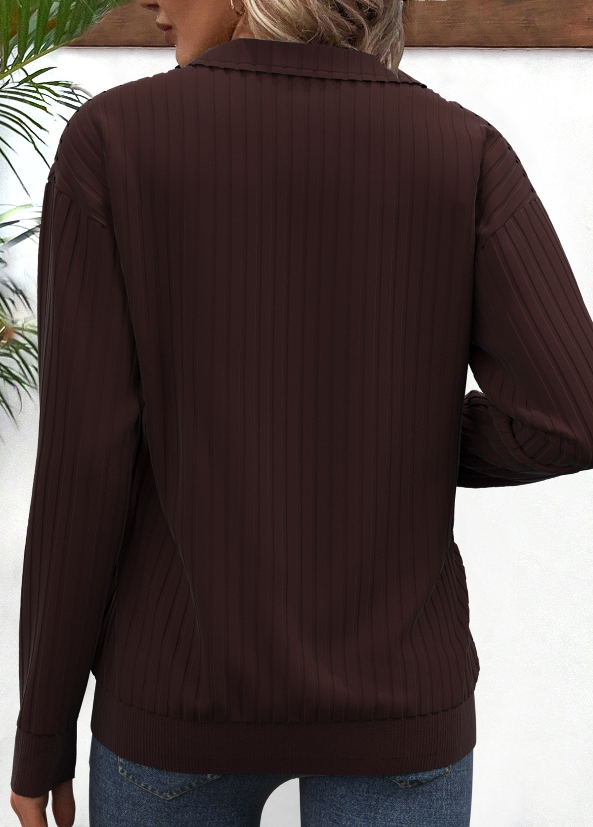 SALE Plaid Zipper Dark Coffee Long Sleeve V Neck Sweatshirt Rosewe®