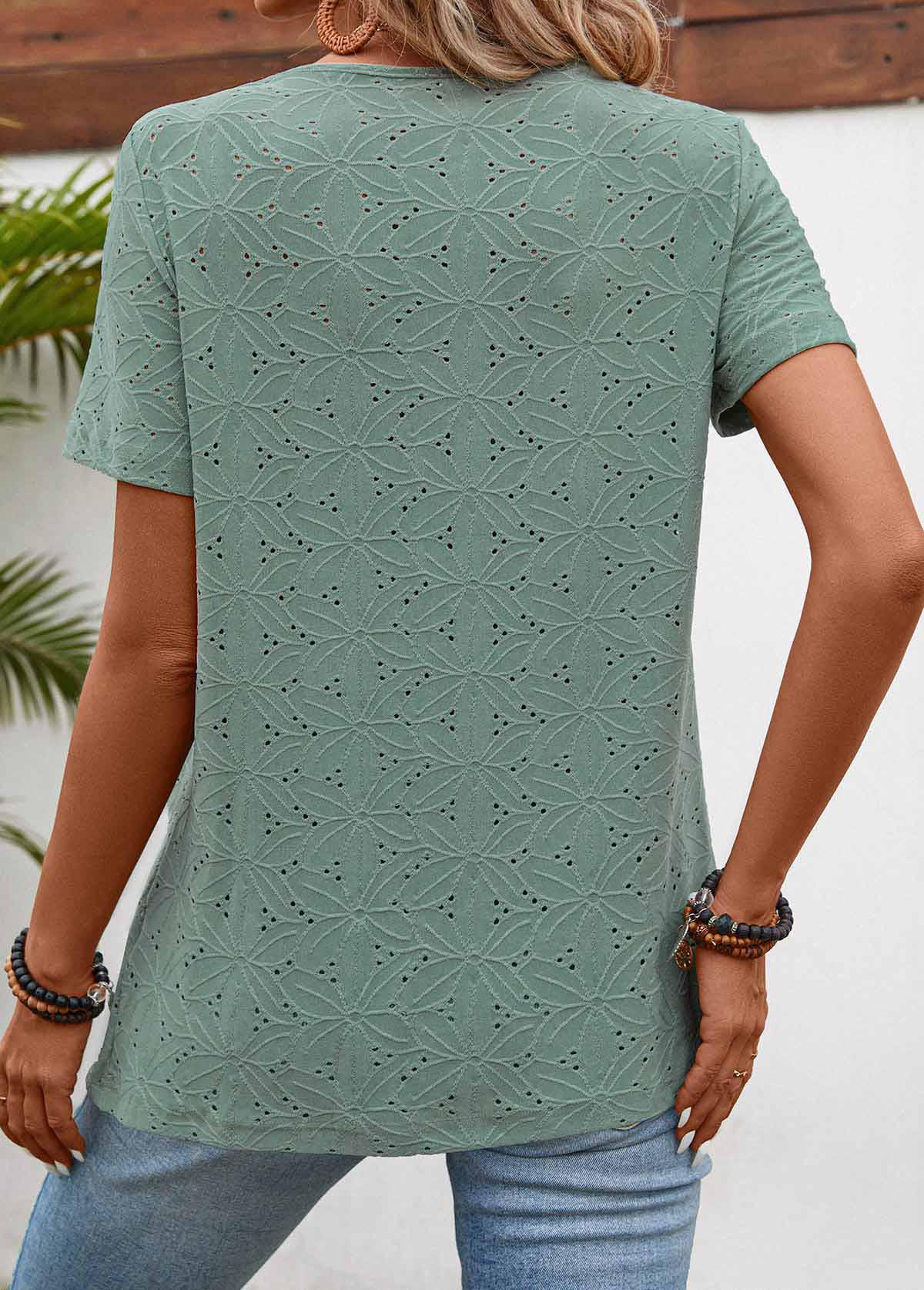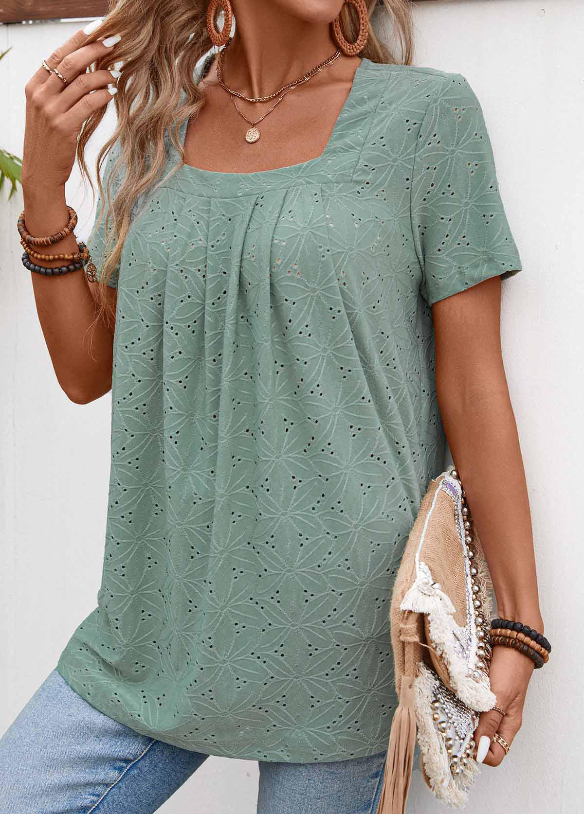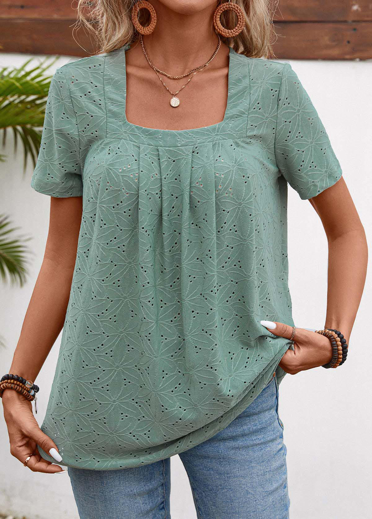 SALE Pleated Sage Green Short Sleeve Square Neck T Shirt Rosewe®