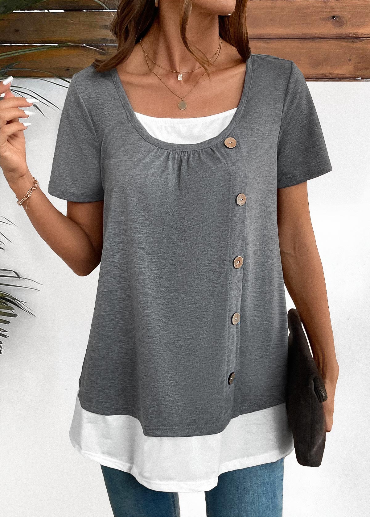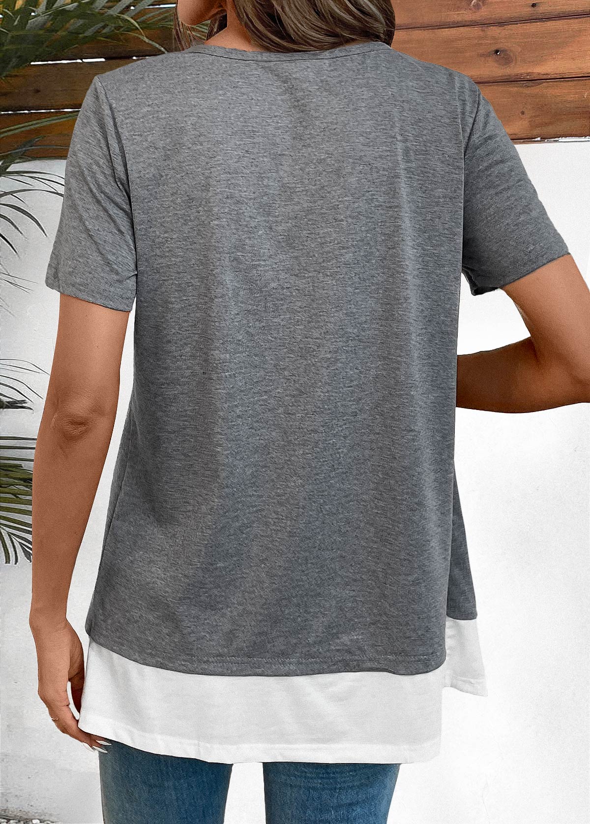 SALE Plus Size Dark Grey Marl Patchwork Short Sleeve Blouse Rosewe®