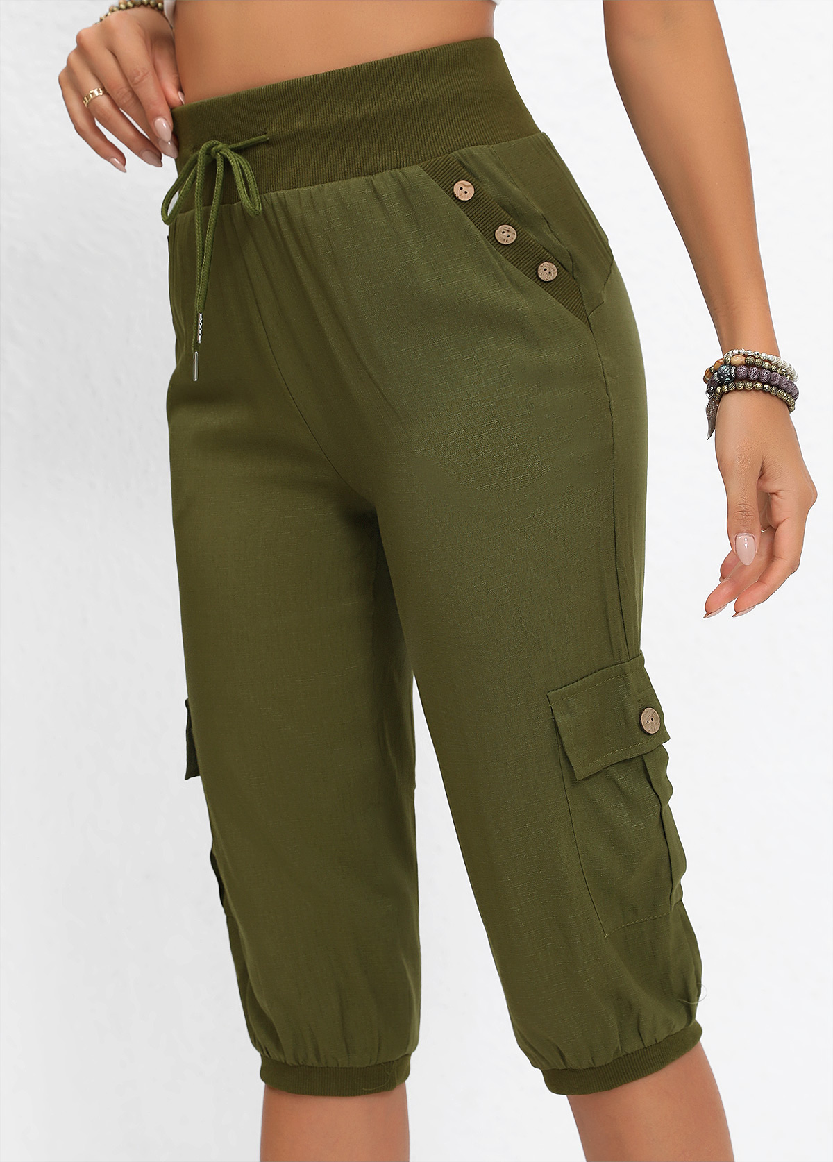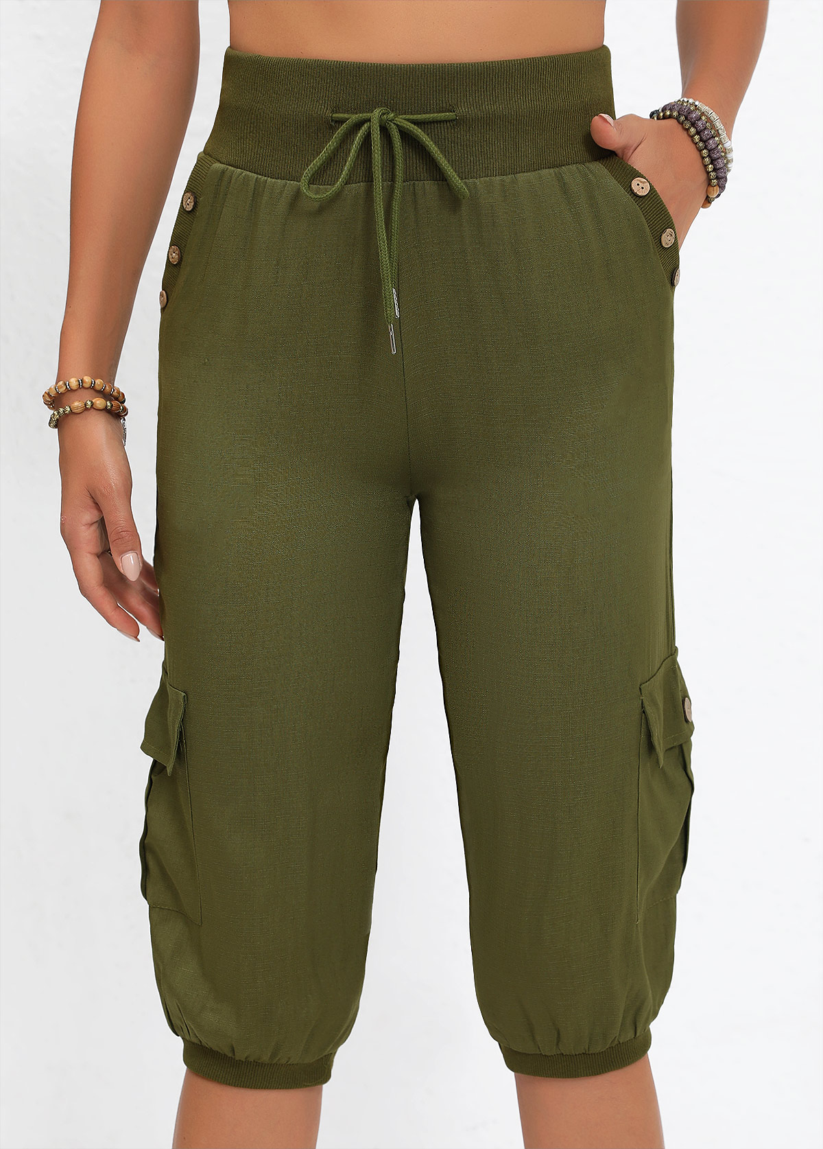 SALE Pocket Olive Green Jogger Elastic Waist High Waisted Pants Rosewe®
