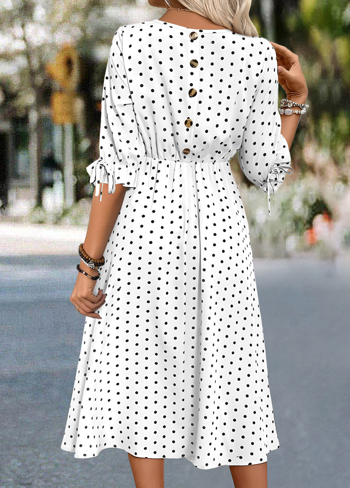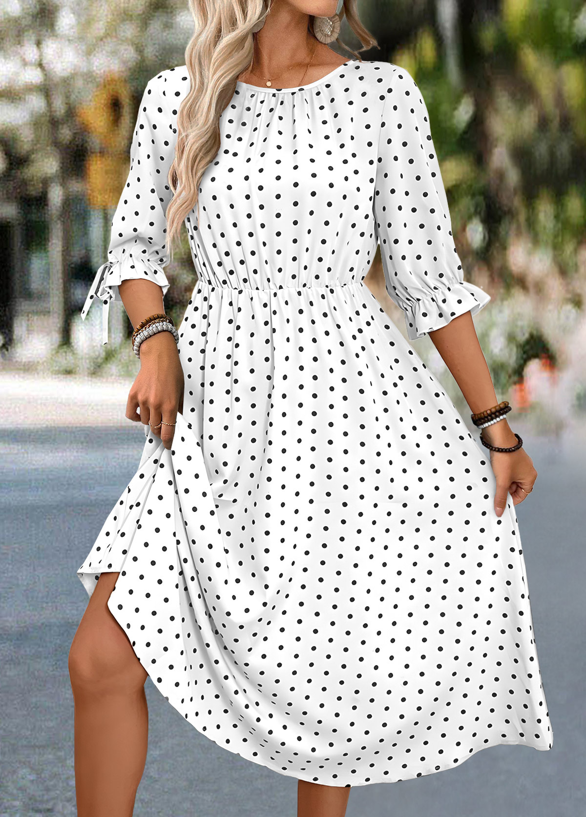 • Polka Dot White Half Sleeve Round Neck Dress