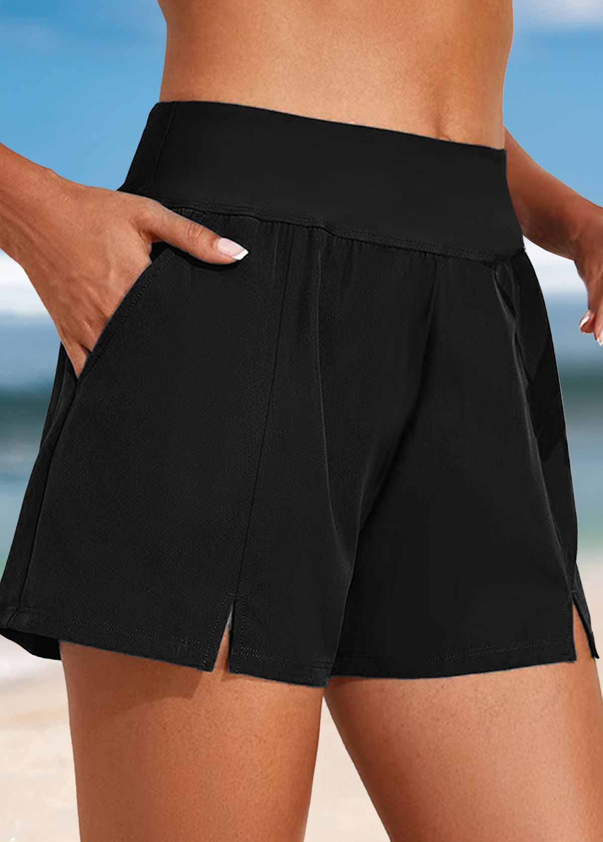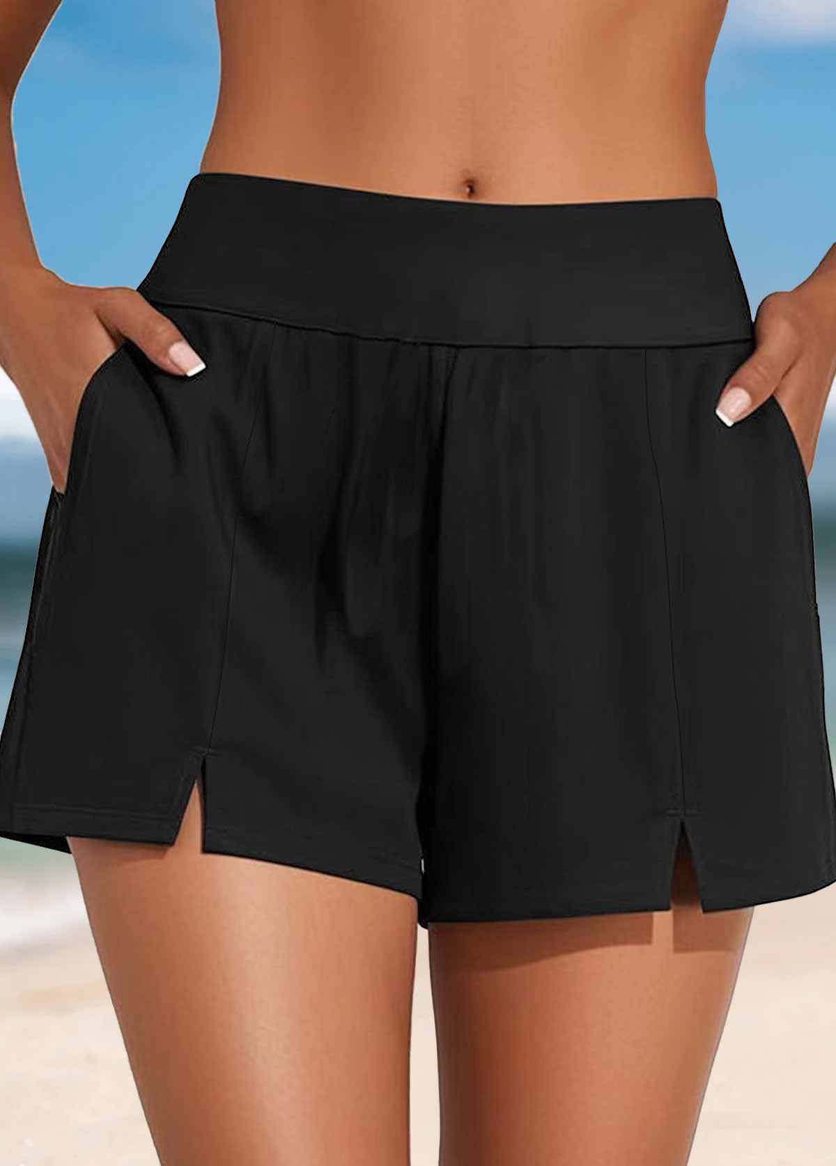 Mid Waisted Elastic Detail Black Swimwear Shorts